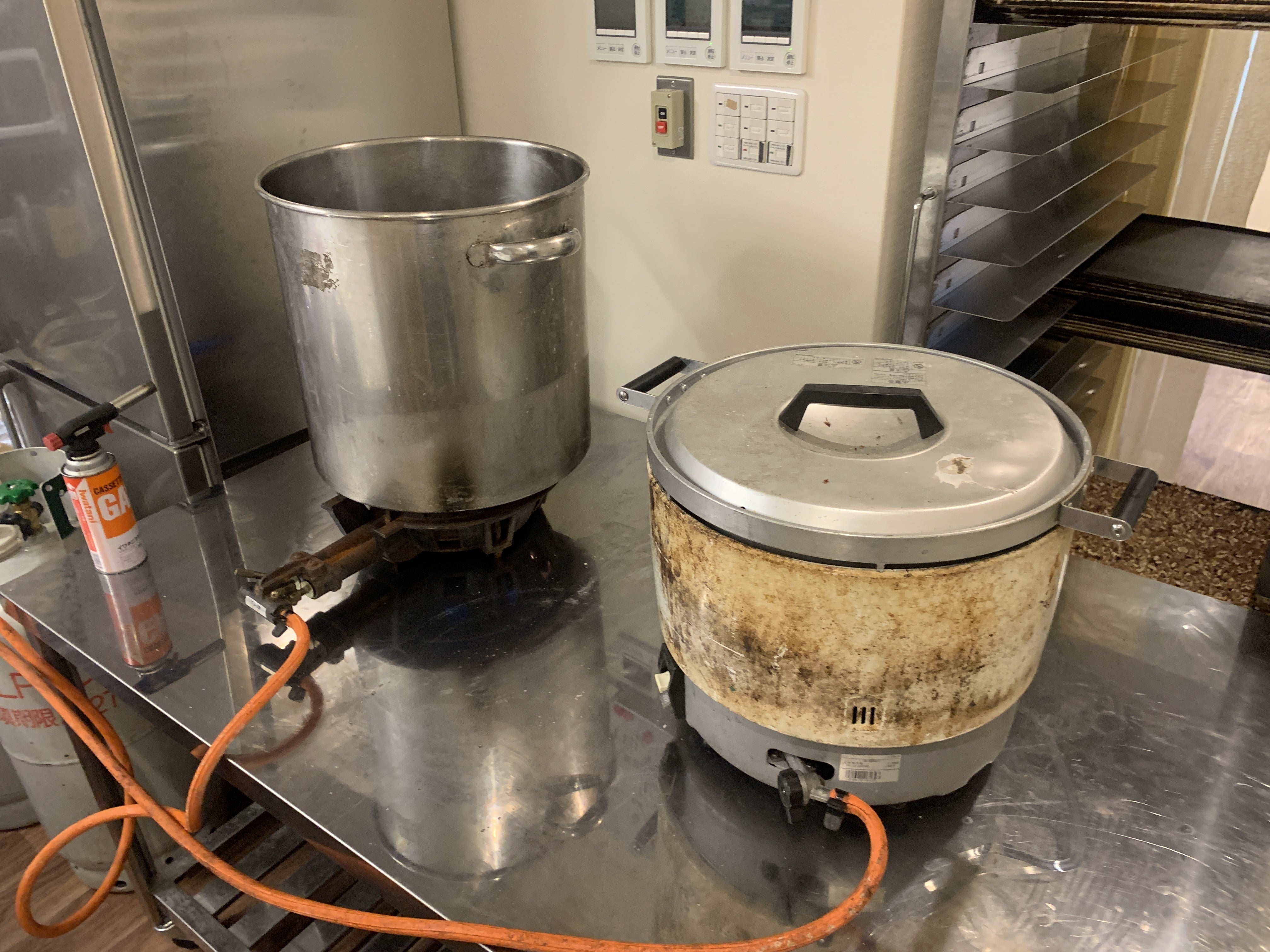 業務用炊飯器や保温機、ガスコンロ等の調理器具は業者からレンタルしたものを使用しています。