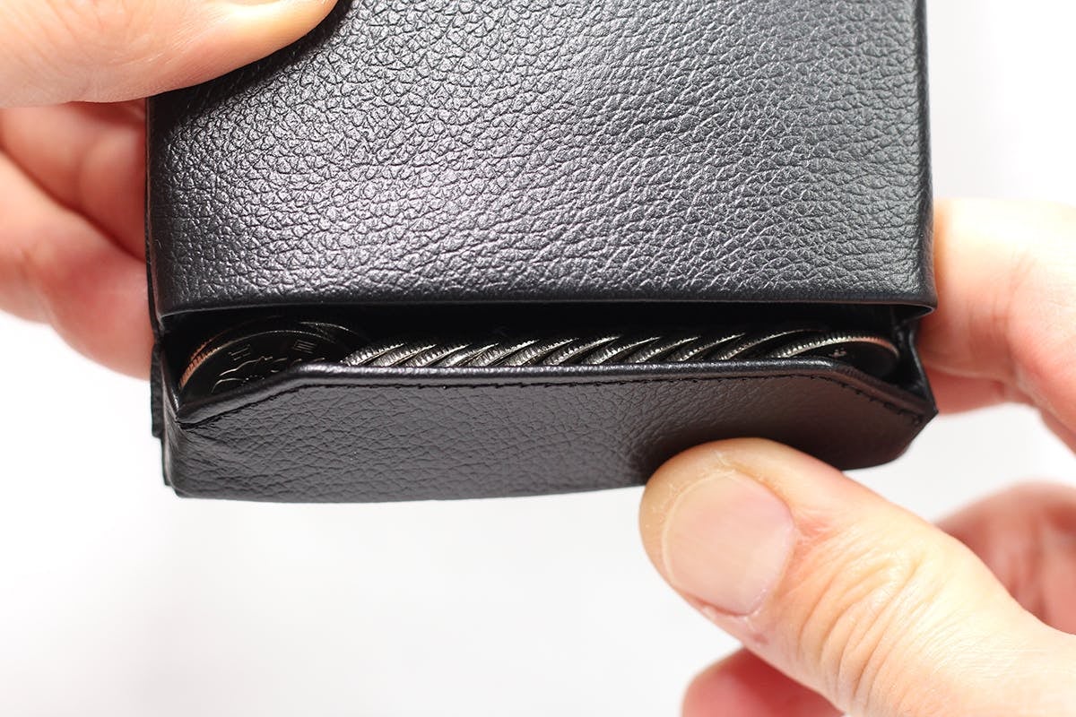 コインケースを折り込めば簡単にロックすることができ、振動を与えてもコインが落ちてしまうようなことはありません。
