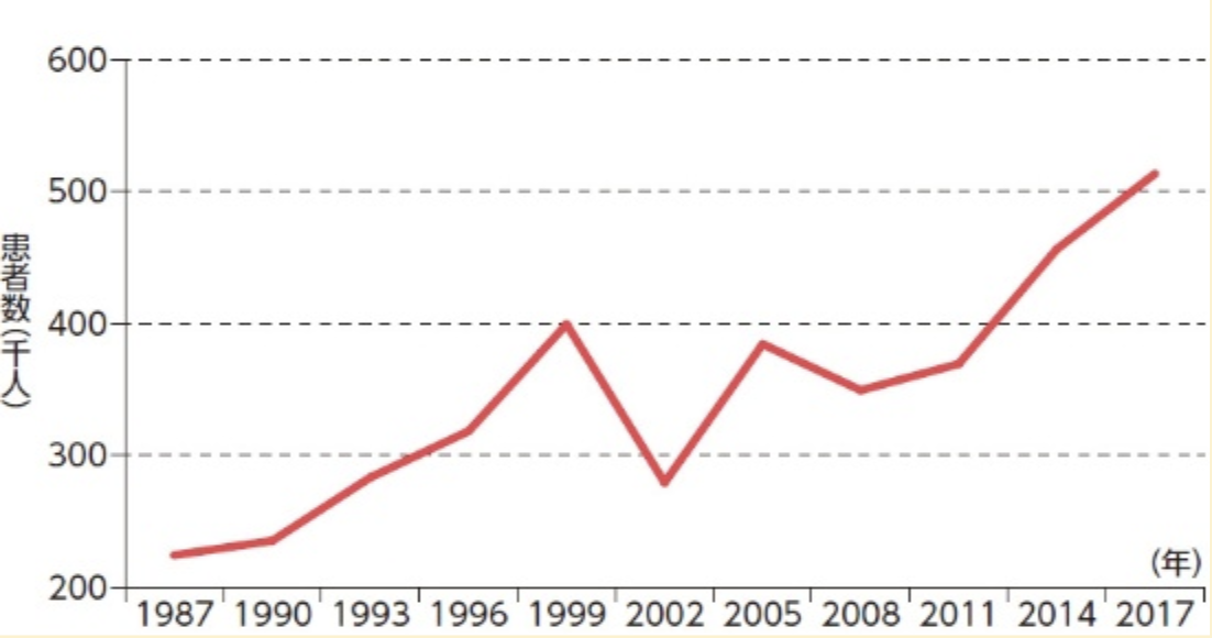 アトピー性皮膚炎の患者数はこの30年で2倍以上に増え、50万人を超えた。(出典:厚生労働省「平成29年患者調査」〔傷病分類編〕)