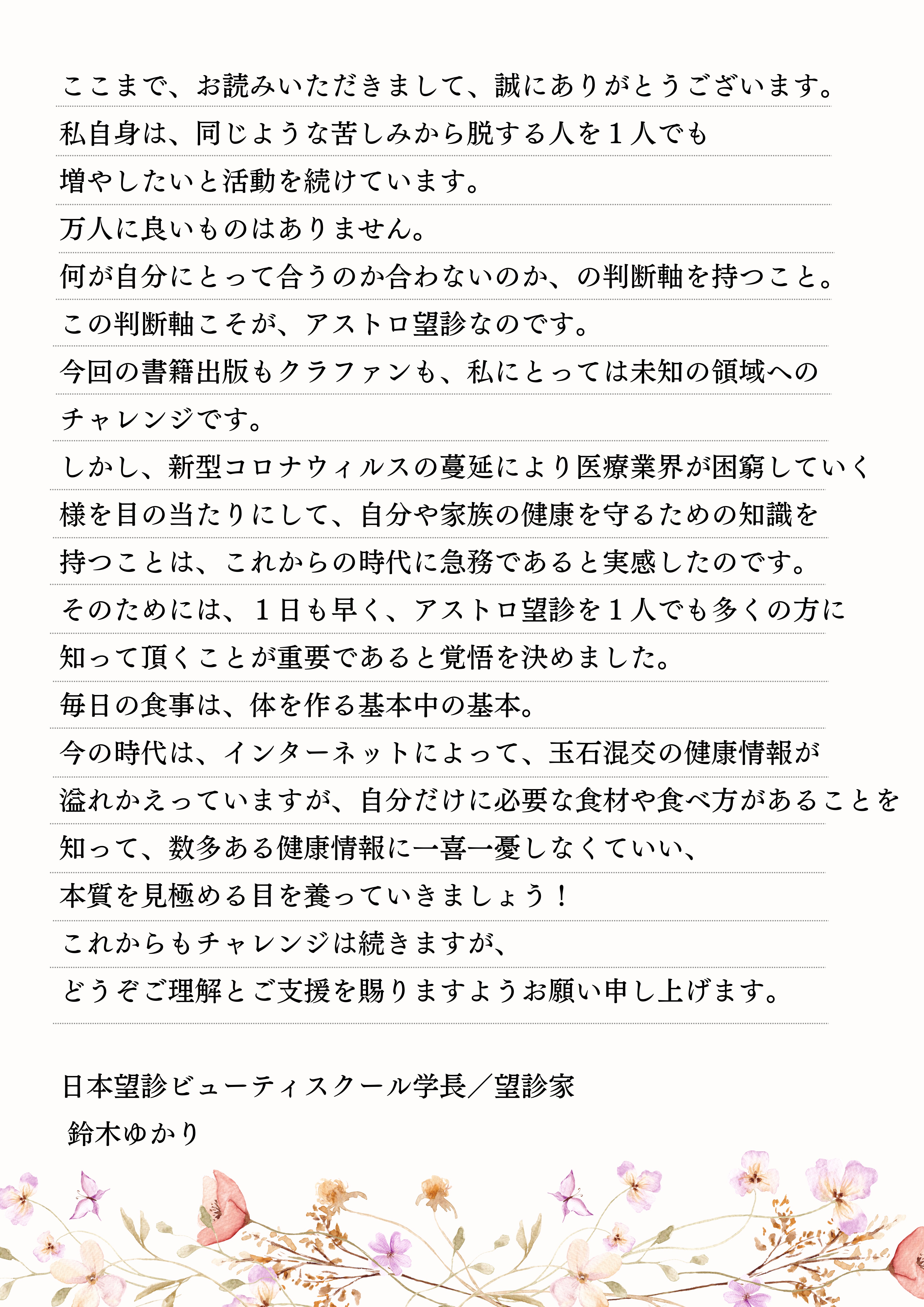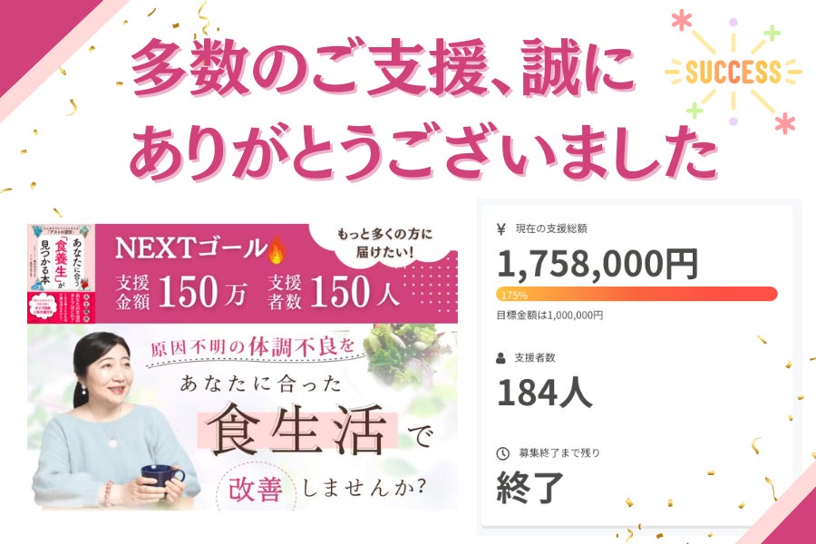 2024/05/01 13:28昨日4/30をもちまして、クラウドファンディングが終了致しました。結果は、184名もの方に1,758,000円のご支援をいただきました。改めて、ご支援をいただいた方々に感謝の氣持ちでいっぱいです。本当にありがとうございます。リターンにつきましては、順次メールにてご案内させていただきます。 私にとって初めての書籍出版、初めてのクラファン挑戦で、本当にご支援くださる方がいるのだろうかと、正直不安な日々が続きました。ですが、私たちの活動に共感いただき、こんなにもたくさんの方にご支援いただき、そして一人でも多くの方に「アストロ望診」を知っていただけたことに大変嬉しく思っております。 ここからがスタートです。このクラファンでの成功を強力なエンジンに変え、これからも食事迷子になってしまっている方や、原因のわからない不調に悩まされている方に対して、「アストロ望診」を通じてサポートし、誰もが毎日を豊かに暮らせるようにしていきたいと思っております。 今回のクラファンで皆様から頂いた支援と期待に応えられるように、今後とも精一杯努めてまいりますので、引き続きご指導ご鞭撻のほどよろしくお願いいたします。鈴木ゆかり もっと見る