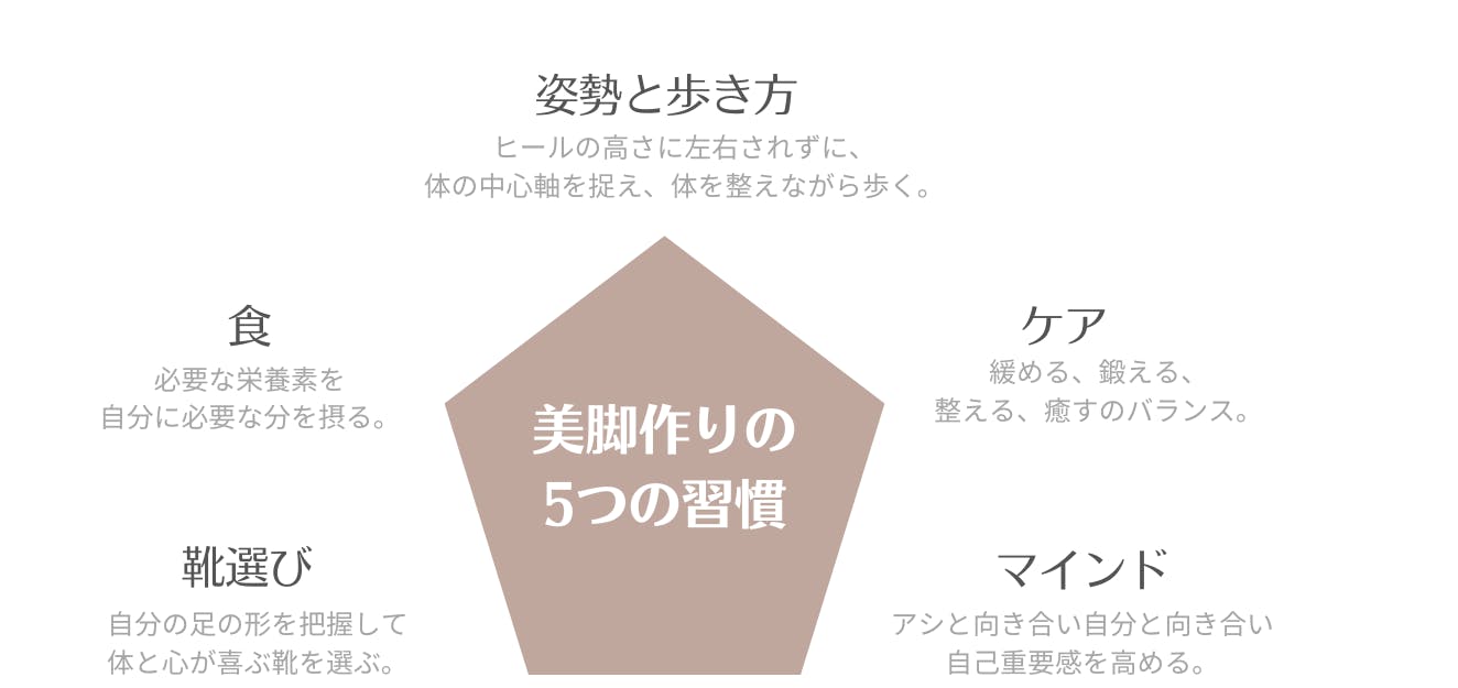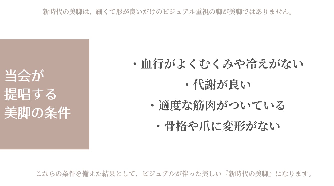 この5つの習慣を身につけていただき、コンテストの後も続けられて、コンテスタントのご家族を含めた周りの方にも足の健康習慣を伝わるようなビューティートレーニングを構成しています。