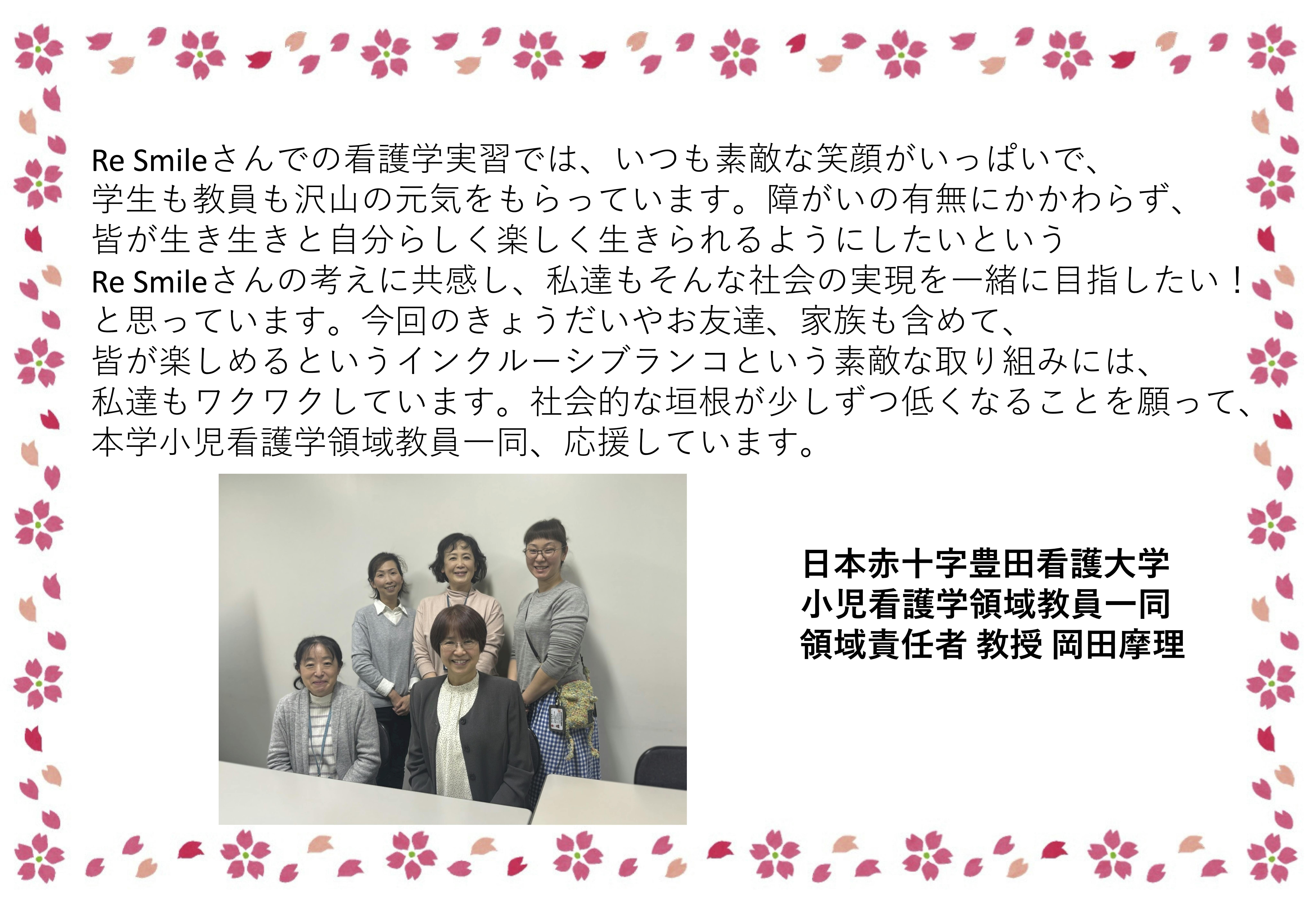 普段は、一般社団法人Re Smileで重症心身障がい児・者、医療的ケア児・者を中心とした障がい福祉サービスをしております。