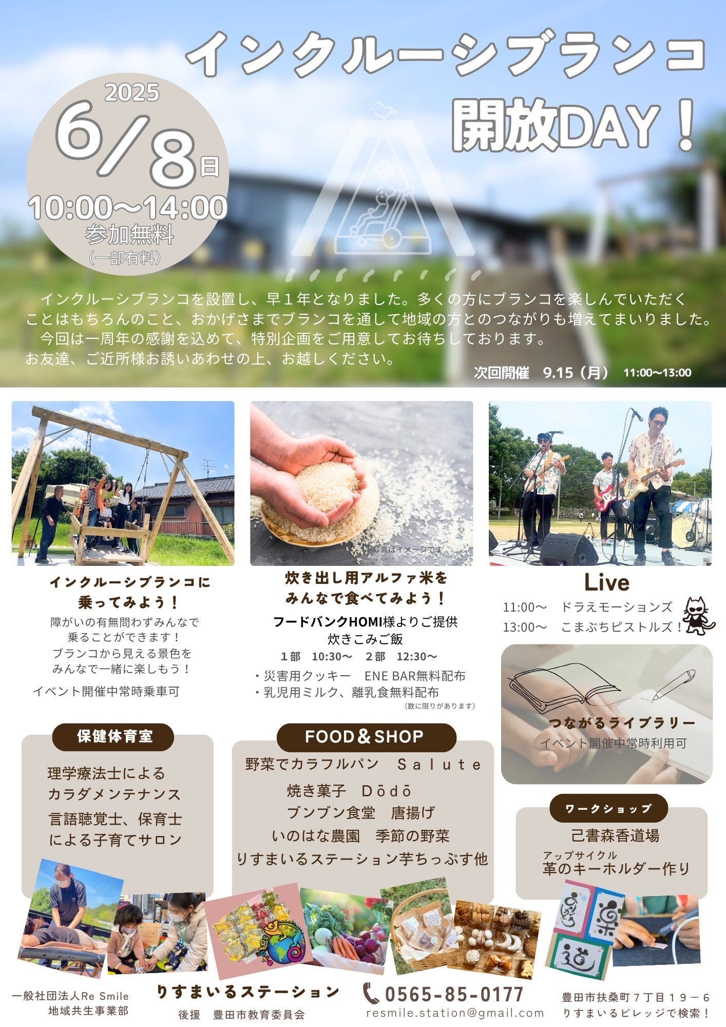 2025/05/23 17:30福祉事業所のご利用者さんスタッフさん、きょうだい児、お父さん・お母さん、おじいちゃん・おばあちゃん、保育・看護・リハビリの学生、地域の小中学生などなど、合計300名程の方々にインクルーシブランコを体験してもらっています。クラファンにご協力して頂いた全ての皆様方に改めて、心より感謝申し上げます。定期的に開催してきた、インクルーシブランコ開放デー。設置から1年をお祝いして6月8日(日)に開催します!福祉系バンド、ドラえモーションズのLIVEや災害食の体験(フードバンクHOMI様提供)など盛りだくさんです。是非、遊びにきてください。Facebookhttps://www.facebook.com/share/16byQiKEfz/?mibextid=wwXIfrInstagramhttps://www.instagram.com/resmile.buranko?igsh=MWRpZXlmaHNyMjA3dA== もっと見る