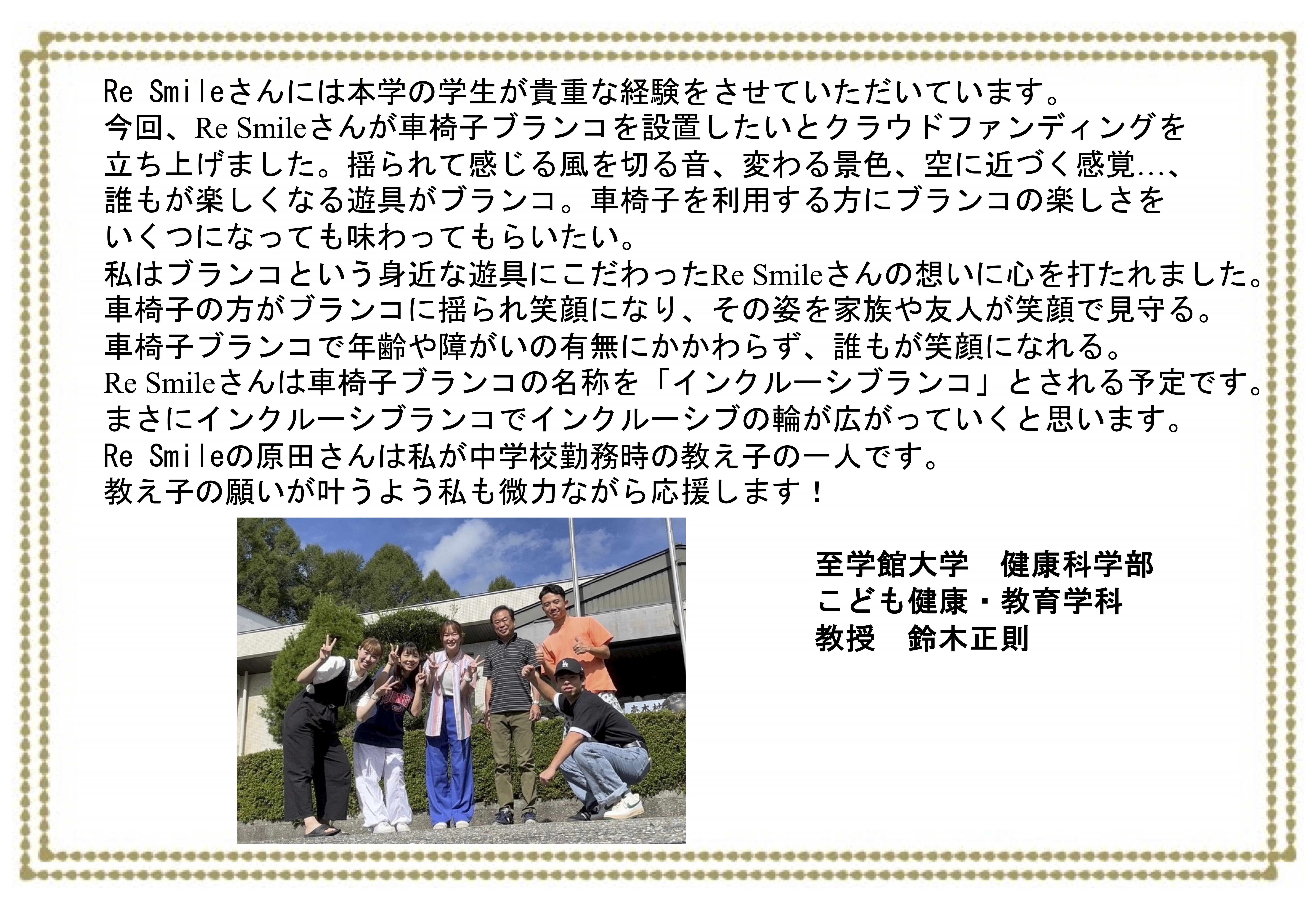 誰もが幾つになっても楽しめるブランコの実現に向けて、ご協力の程、よろしくお願いいたします!!