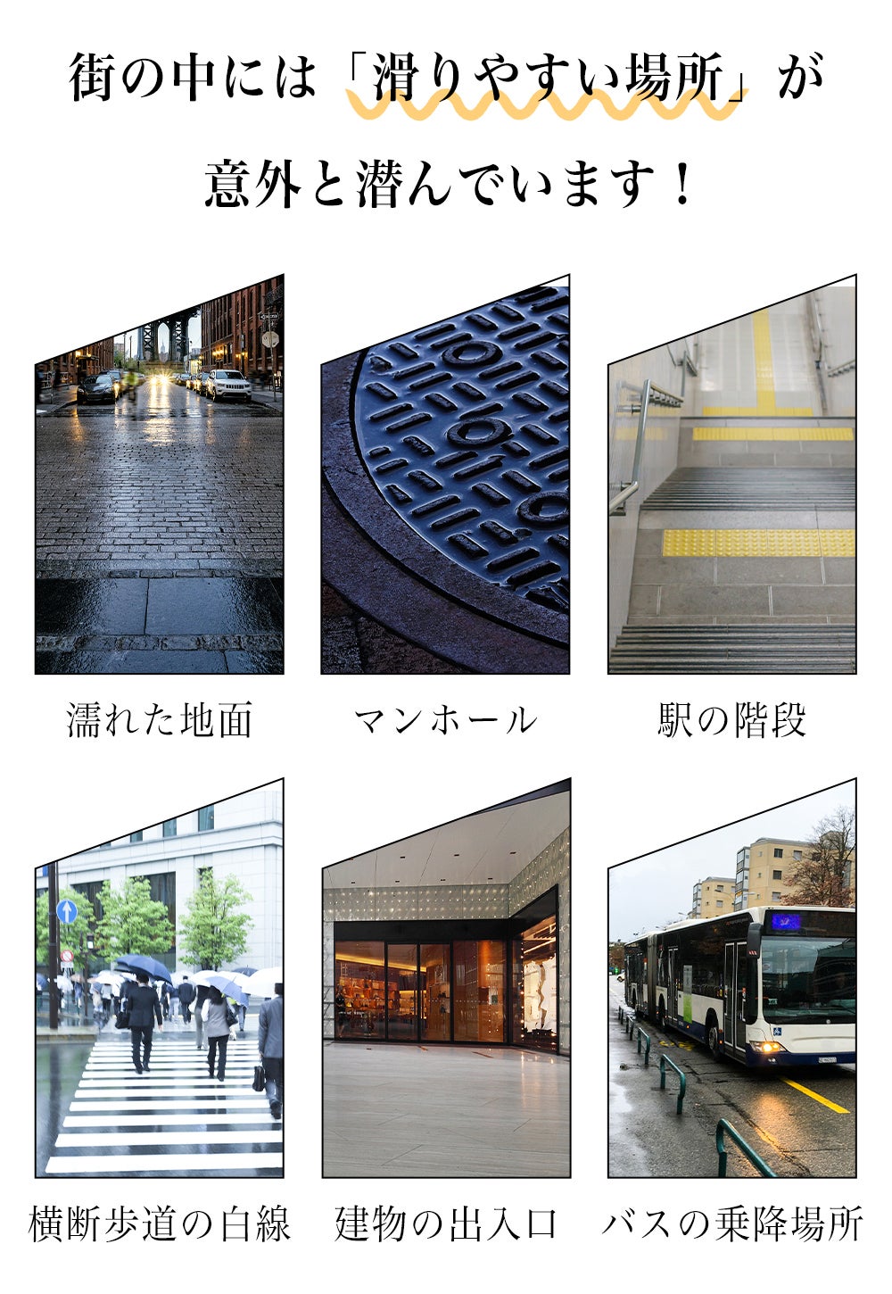 街中には様々な状況があります。雨の日の濡れた路面、繁忙な歩道、そして予測不可能な滑りやすい場所。