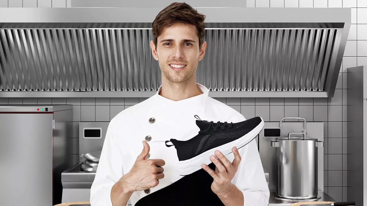 厨盾(キッチンシールド)はキッチンのプロフェッショナルに向けたフットウェア分野での革新に挑戦してまいりました。キッチンでの作業における安全性の向上に焦点を当て、滑り止め技術の研究と改良に努めてきました。
