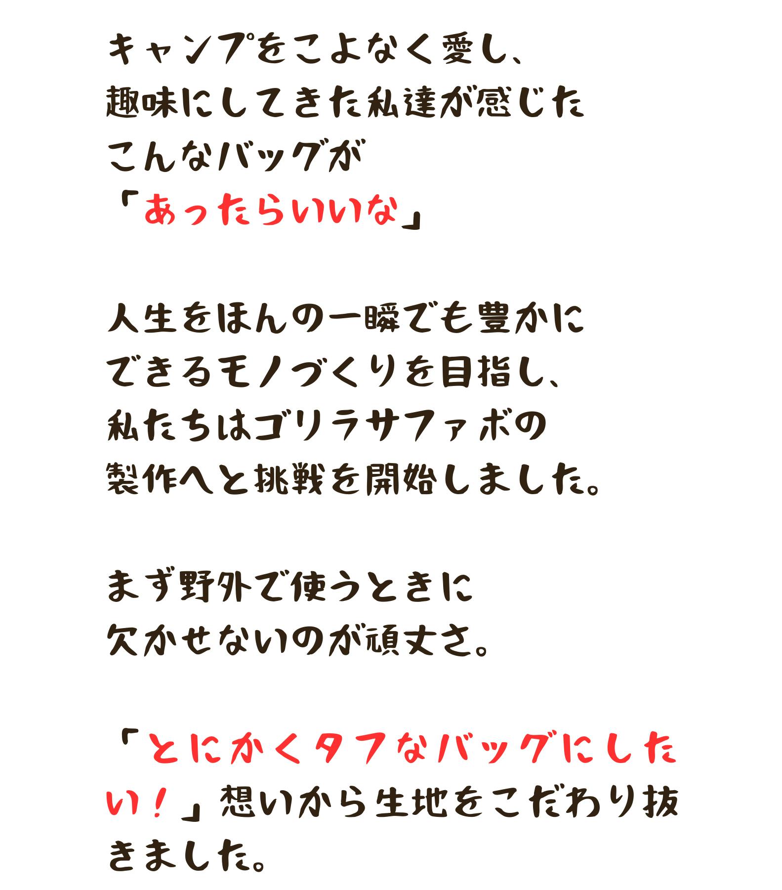 ・GORILLA SAFABOは、頑丈で固い素材で作られております。折り畳んだ状態での配送となりますので、お届け時には折り目がついている場合もございますが、ワックスキャンバス生地のため、徐々に馴染んでいきます。経年変化も楽しめる味わい深い育てるバッグです。