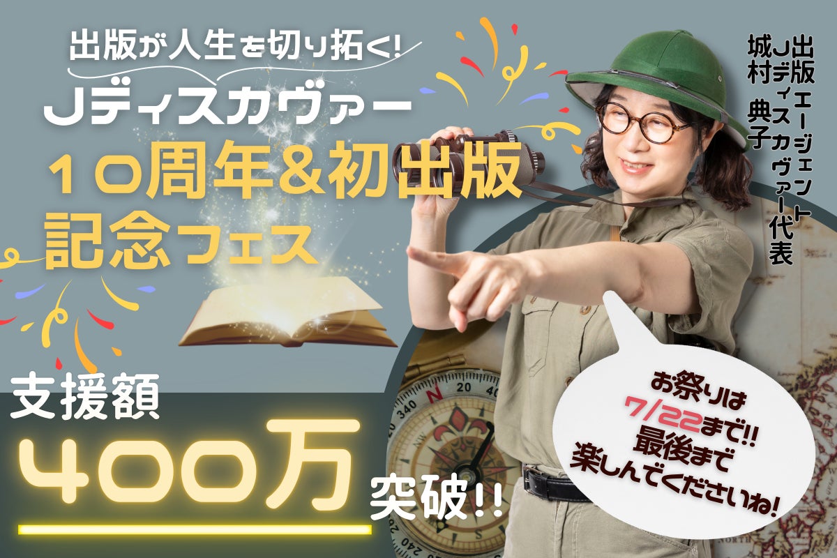Jディスカヴァー10周年&城村初出版記念フェスも、残すところあと1週間!!おかげさまで、143人の方から400万円近くのご支援をいただいております。さて、本日は「えっ!もうあと1週間なの? どのリターンにしようか迷っていたら、あっという間に日が経っていた!」という方に向けて、見逃し厳禁のリターンをご紹介します!① あと2人!!サイン本+本書の出版企画書城村のサイン入り書籍と共に、刊行著書の実際の出版企画書のセットでお届けします。『城村本(仮)』の骨組みを出版企画書から紐解ける、これから出版を目指している人必見のリターンです!②編集者や著者の方と出会える?! 10周年&初出版記念パーティー城村×編集者さんの制作秘話対談が聞けるほか、ベストセラー作家のK先生の他、すでに出版を経験されている著者の方や編集者の方もご参加される予定です。出版を旗印に語り合いましょう!<イベント概要>・日時:2024年9月7日(土)13時~15時・会場:東京都 銀座 THE GRAND 47 〒104-0061 東京都中央区銀座6丁目10番1号 GINZA SIX 13F※飲食代は含まれています※現地までの交通費などはご負担ください③城村の聖地高円寺で、ヒミツのランチ会城村率いるJ.ディスカヴァーを育む高円寺。その地で城村とのランチはいかがでしょうか?城村がお連れします!<イベント概要>・日程:8月23日(金)・時間:12時にJR高円寺駅集合~14時予定※飲食代は含まれています※現地までの交通費などはご負担ください④出版をしたい人必見!!出版企画力診断城村典子があなたの企画をプロの目線で診断します。企画書もしくは事前アンケートをもとに30分のディスカッション。終了後には診断書をお渡しします。※企画書が現時点でなくてもOK!企画書がある場合は企画書をもとに診断します⑤10周年記念フェス超特別企画!1年間城村の個別セッション受け放題権J.ディスカヴァーの著者育成&商業出版実現プログラム"出版アドベンチャー"。通常3回の城村との個別セッションを、創業10周年記念特別企画として「1年間の個別セッション受け放題」でご案内。詳細を聞きたい方はお気軽にお問い合わせください↓info@jdiscover.jp気になるリターンは、忘れないうちに!!あと1週間、引き続きよろしくお願いします!