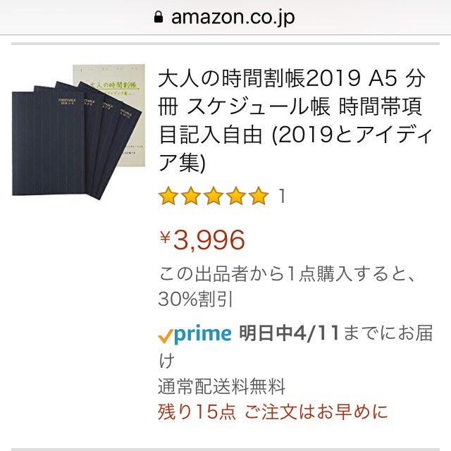大人の時間割帳2019年の日付入りのみ、Amazonで4月30日まで30%オフで販売しています。