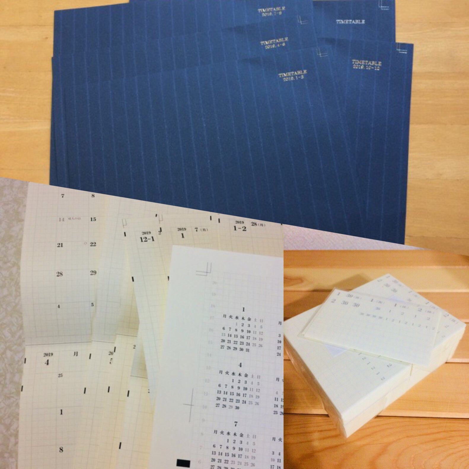 こんばんは。締切に追われていたので、7月下旬の進捗報告が少し遅くなりました。 ひとまず7月の間にどこまで進んだかを報告させていただきますね。 前回は紙を発注して、大人の時間割帳2019の表紙と日付のデータを作って入稿してきたお話でした。 今回は、印刷がどんどんできてきています。印刷見本を一部送っていただきました。 大人の時間割帳の表紙は、イタリア製のセビロ-FSという、高級スーツのようなかっこいいストライプなので、表紙印刷も高級感のある箔押しにしています。セビロ-FSを見た時、ストライプの感じが、ビジネスセレブがイタリア製の三つ揃えのスーツを着ているイメージだったので、イケメンっぽい感じにしてみたんです(^-^)v 大人の時間割帳の表紙の箔押しができました!(画像上)セビロの箔押し、キラキラしていてかっこいいです。紺色もうまく写真に写らないし、キラキラ感もうまく写ってないので、実物の方がかっこいいと思います。 大人の時間割帳の日付の印刷もできました。(画像左) 実際に印刷されると、やっぱりいいですね。来年使うことを考えたらわくわくしてきます。モノクロで、少しレトロで、武骨さとエレガントさがバランスを持って存在するように、フォントと黒のトーンを選んでみました。実は、平日の黒い部分も、真っ黒じゃなくてとても濃いグレーなんです。黒にすると圧迫感があるので、黒に見えるけど真っ黒じゃないところを探しました。 そして来年や再来年は、天皇陛下の譲位に伴って、祝日の変更が多いですよね。来年は天皇誕生日がないこと、再来年は新天皇の天皇誕生日になることと、オリンピックの影響で祝日がけっこう移動していること、ここまでは決まっているようなので、それに合わせて作りました。 ただ、改元に伴い、即位記念日を祝日にするかはまだこれから秋に話し合うみたいなので(スケジュール帳作りには絶対に間に合わない)、どこの手帳も載せられないだろうし、仕方ないかな、ニュースでもするだろうし手帳が平日なので間違って出勤したみたいなことにはならないだろうとは思いましたが、できるだけのことはしたいので、訂正シールを作ってみました。 祝日になるか休日になるかわからないし、それによってまわりの日が休日になるかも変わってくるみたいです。それにまだ休みと決まっていないのに載せるわけにもいきません。 そのため考えられるパターンで、上から貼る用の訂正シールを作ってみました。(画像右) シールの印刷屋さんによると、これ以上細かく切れないそうです。引き受けられる範囲で、よくしていただきました。使う際に、一部はさみで切って使っていただけたらと思います。 同時に、ミニチュアカレンダーシールのデータも作って入稿してきました。リーフも表紙と、時間割の紙のデータを作って入稿してきました。 つまり7月末までに、半分くらいのデータができて印刷した状態です。次は印刷されたものを製本する段階に入るのと、残りのデータを作って印刷です。 8月上旬の活動報告は、また近いうちにさせていただきます。