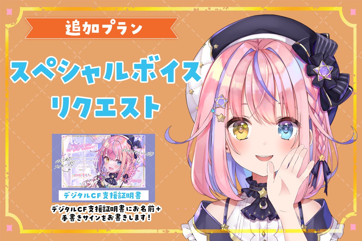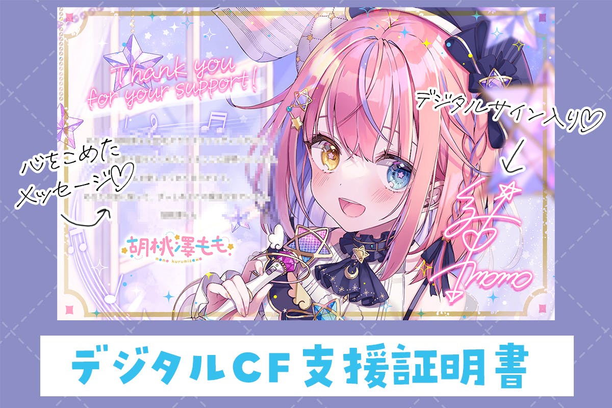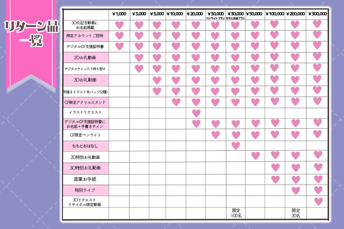 ・3D化記念動画にお名前掲載・限定X(Twitter)アカウントへご招待・デジタルCF支援証明書・2D/3Dお礼メッセージ動画・デジタルサイン入り待ち受け・胡桃澤もも手描きイラスト缶バッジ(2種)・CF限定アクリルスタンド・デジタルCF支援証明書にお名前+手書きサインをお書きします・CF限定ペンライト・2D/3D特別お礼動画・胡桃澤もも直筆お手紙・あなただけに贈る特別ライブ