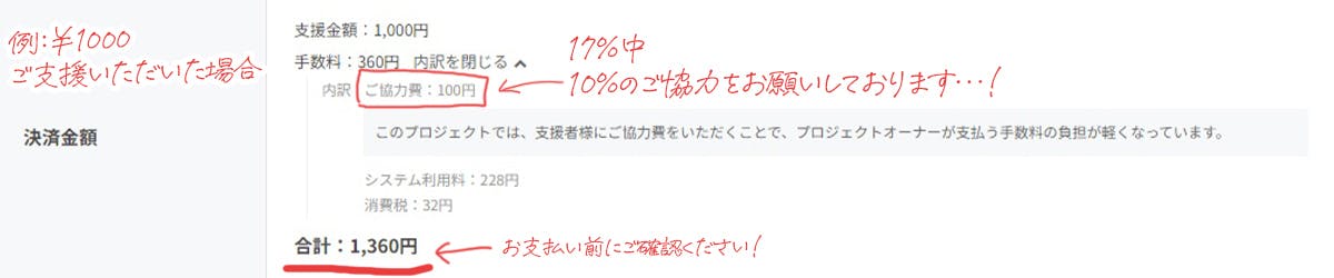 ご支援額、システム利用料、消費税とは別に支援額の10%を支援者さまに「ご協力費」としてお支払いいただいております。