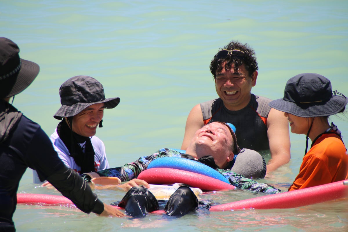 何十年ぶりの海水浴とのことで大変喜ばれ、うつ伏せにして欲しいとの本人の要望で顔を海水につけるなどの体験しました。
