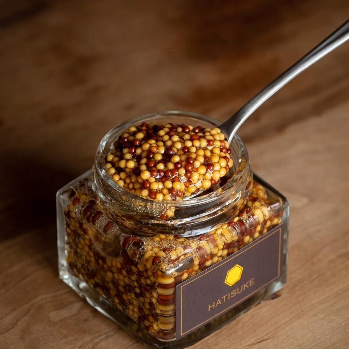 こちらは、食品添加物や保存料を一切使用せずに手作りされた粒マスタードです。八助の蜂蜜がコクを加え、しっかりと酸味の効いた味わいを実現しました。栽培期間中、農薬不使用のお米からできた京都の米酢と大粒のマスタード、醤油、天然塩を使用し、厳選された素材だけで作り上げました。お料理の引き立て役として、お肉料理やサラダ、ドレッシング等に加えるだけで、ピリッとした辛みと深い味わいが楽しめます。贅沢な素材と丁寧な手仕事が生み出す大人の味を、ぜひお楽しみください。