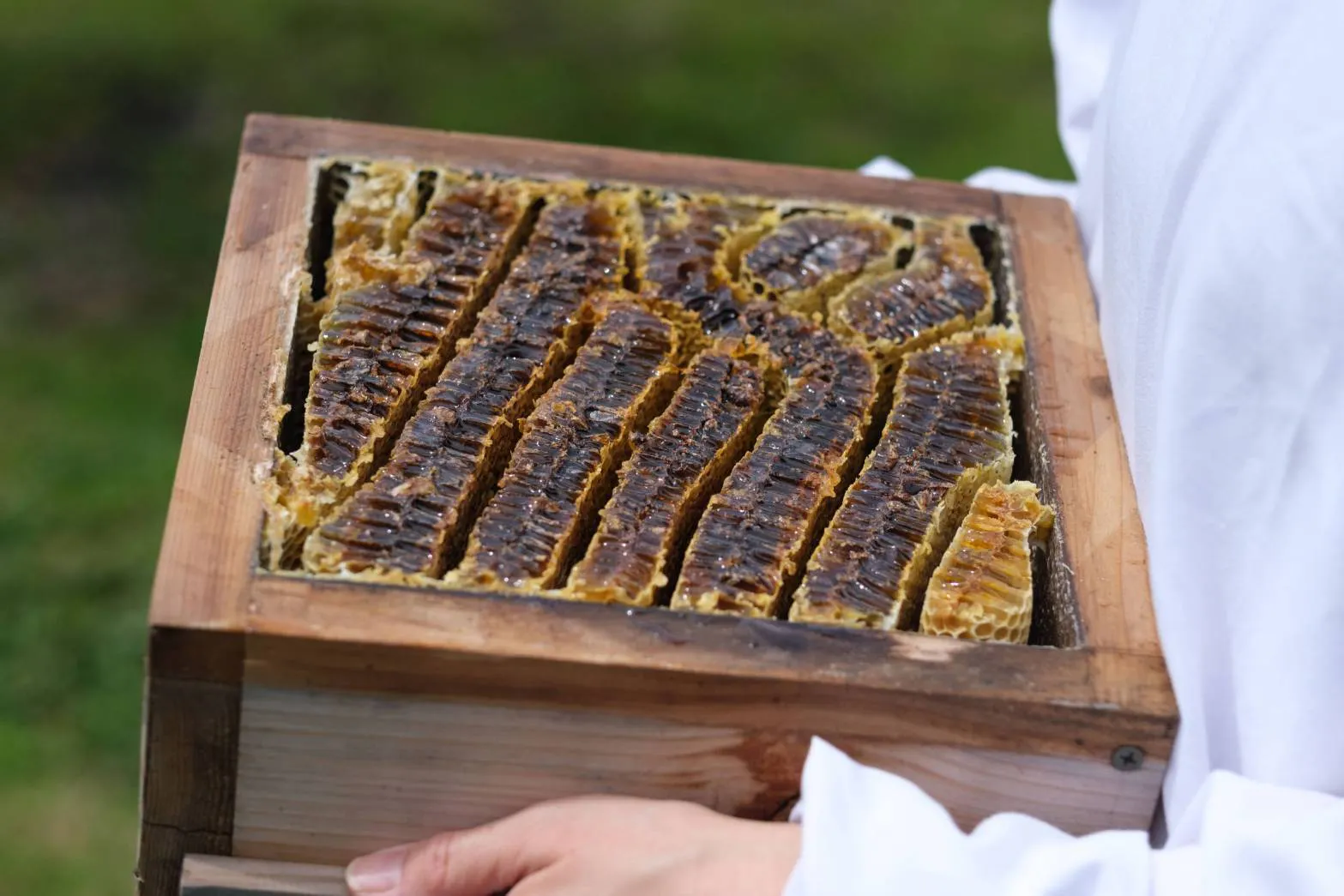 ・HATISUKEでは化学薬品を一切使用せず、ミツバチを飼育し、一年に一度だけ採取します。