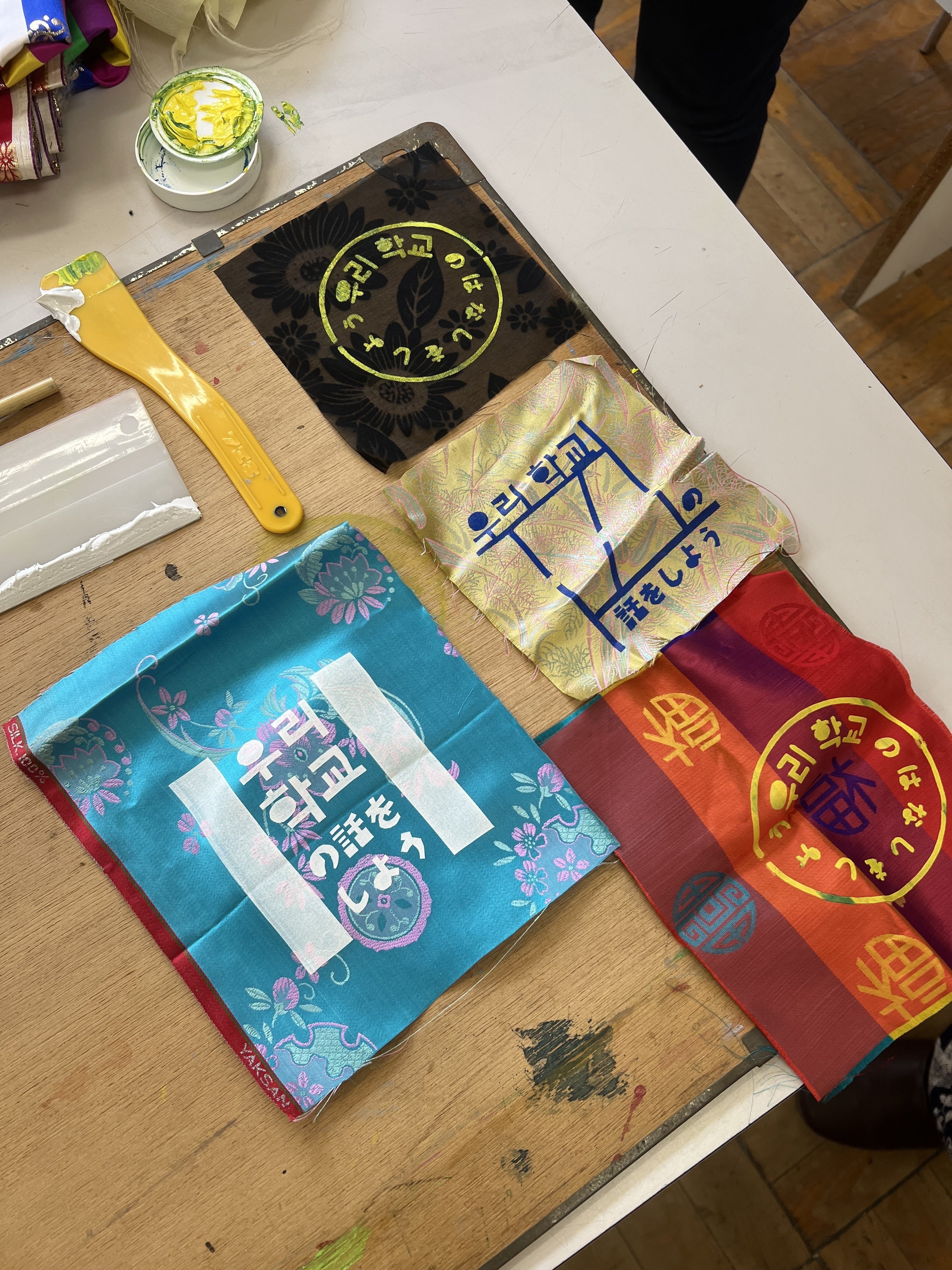 デザインはそれぞれ、輪になって話すイメージ、全国にあるウリハッキョの校門のイメージ、チョガッポ(朝鮮式のパッチワーク)のイメージです。フェスタの1週間前にメンバー3人で型をくり抜いて版をつくり、パッチの試作を行いました。
