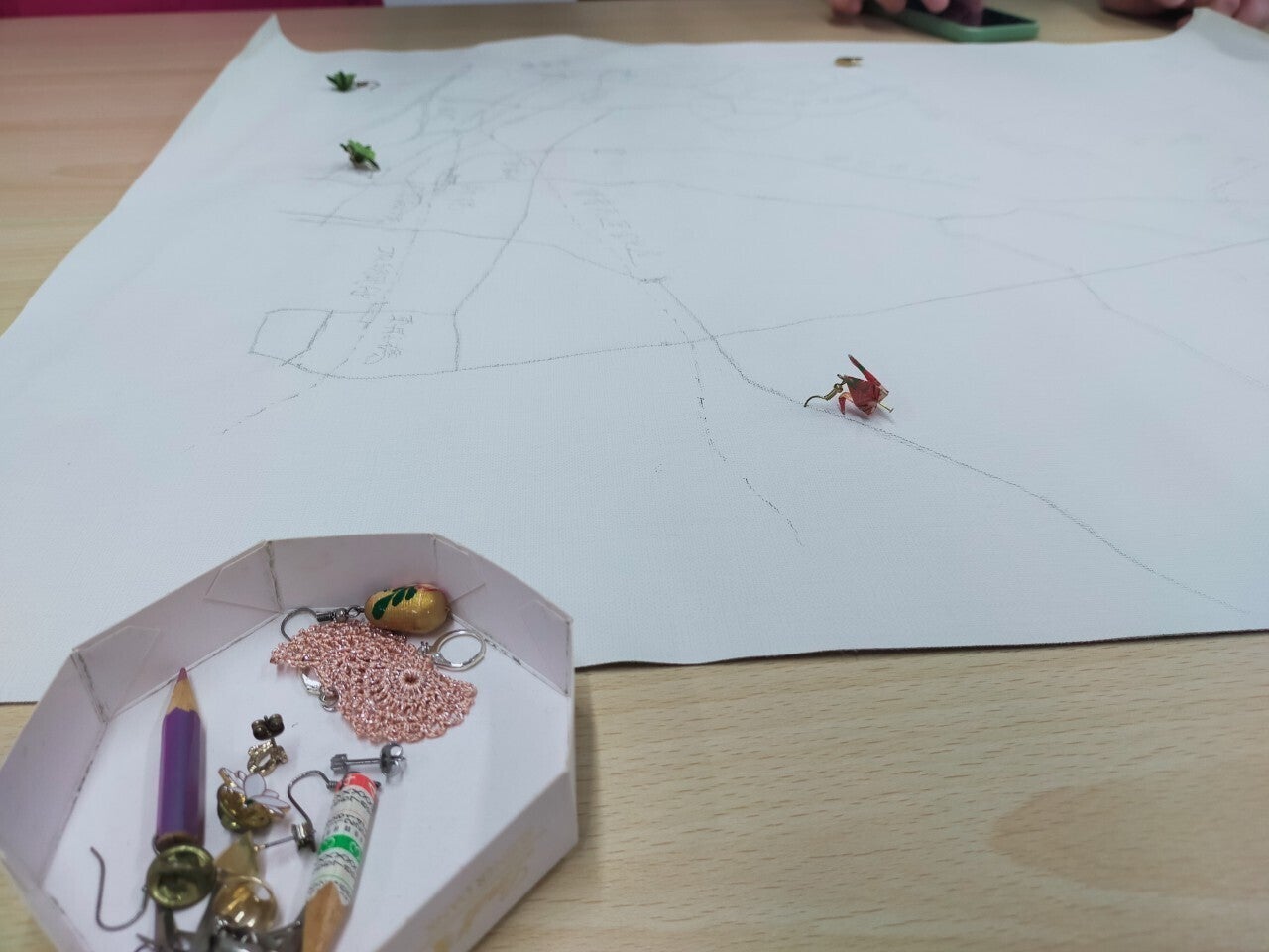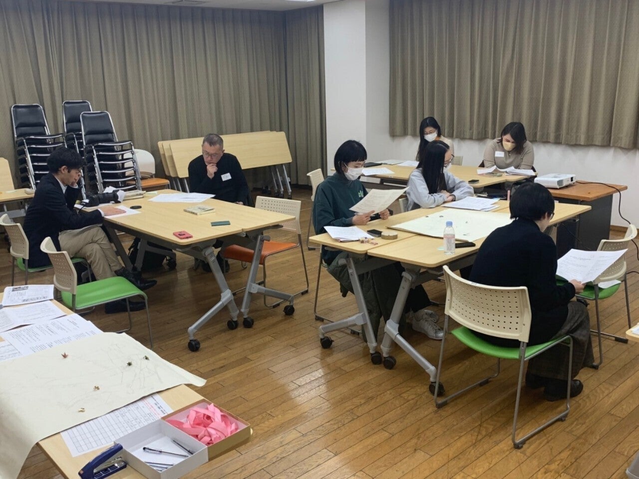 各テーブルに配った地図を広げ、証言内容について話し合いながら、虐殺のあった場所にピアスを通しました。