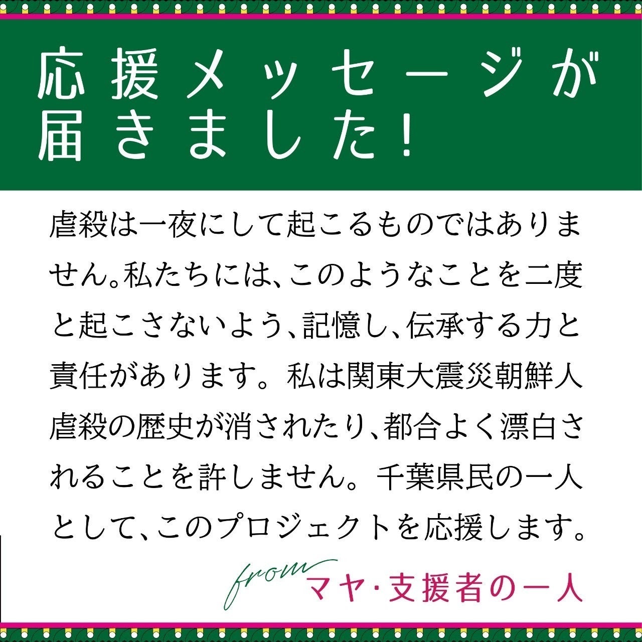 虐殺は一夜にして起こるものではありません。私たちには、このようなことを二度と起こさないよう、記憶し、伝承する力と責任があります。 私は関東大震災朝鮮人虐殺の歴史が消されたり、都合よく漂白されることを許しません。 千葉県民の一人として、このプロジェクトを応援します。 (マヤ・支援者の一人)