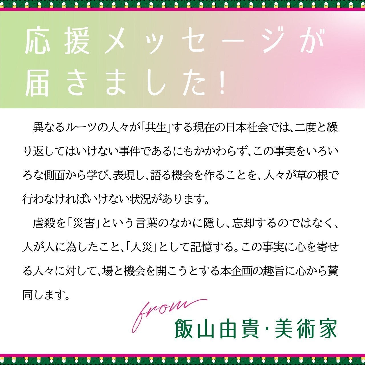 虐殺を「災害」という言葉のなかに隠し、忘却するのではなく、人が人に為したこと、「人災」として記憶する。この事実に心を寄せる人々に対して、場と機会を開こうとする本企画の趣旨に心から賛同します。