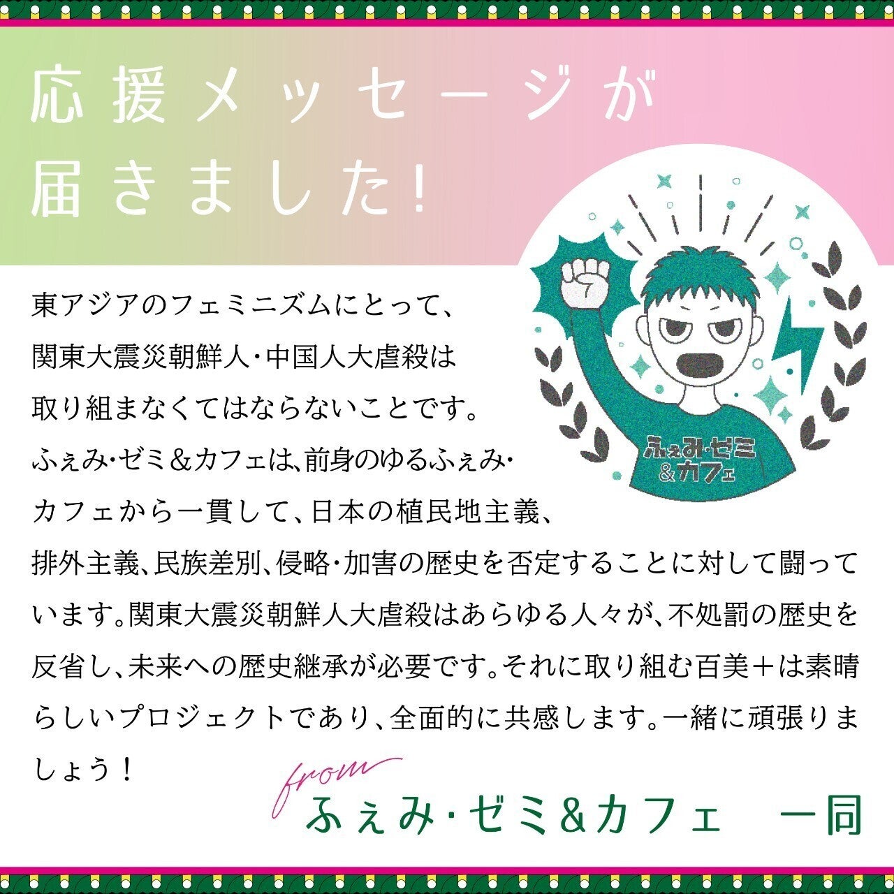 ふぇみ・ゼミ&カフェは、前身のゆるふぇみ&カフェから一貫して、日本の植民地主義、排外主義、民族差別、侵略・加害の歴史を否定することに対して闘っています。関東大震災朝鮮人大虐殺はあらゆる人々が、不処罰の歴史を反省し、未来への歴史継承が必要です。それに取り組む百美+は素晴らしいプロジェクトであり、全面的に共感します。一緒に頑張りましょう!