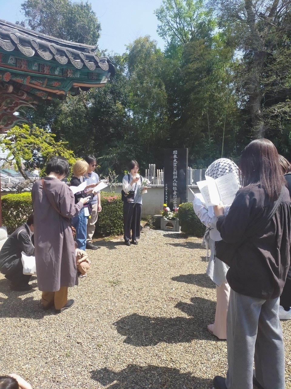ここで百美+のメンバーが、この地で行われた虐殺と遺骨発掘の歴史の証言を読み上げました。なぎの原で虐殺された人々の遺骨の掘り起こしには大変な時間がかかったそうです。(1998年9月24日発掘)しかし最終的には発掘され、この高津観音寺朝鮮人慰霊碑のもとへ納骨されています。