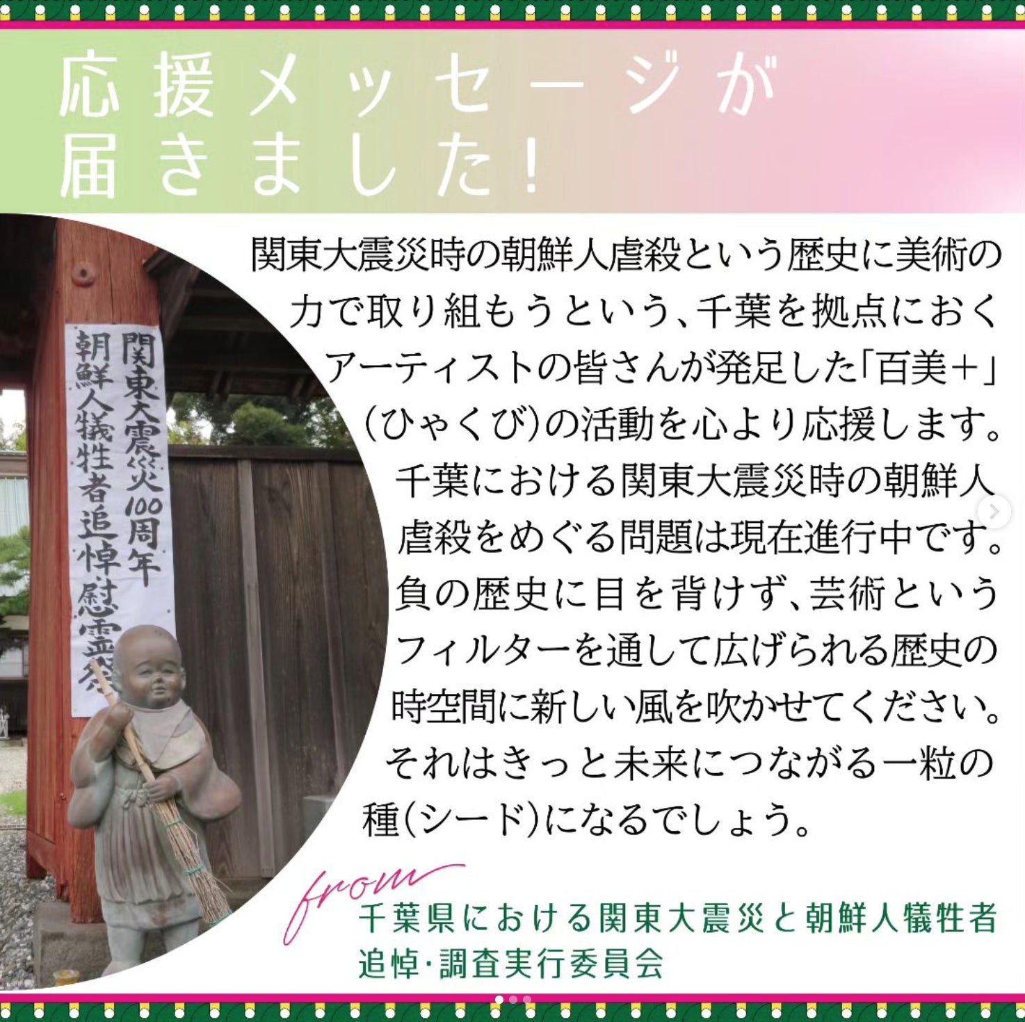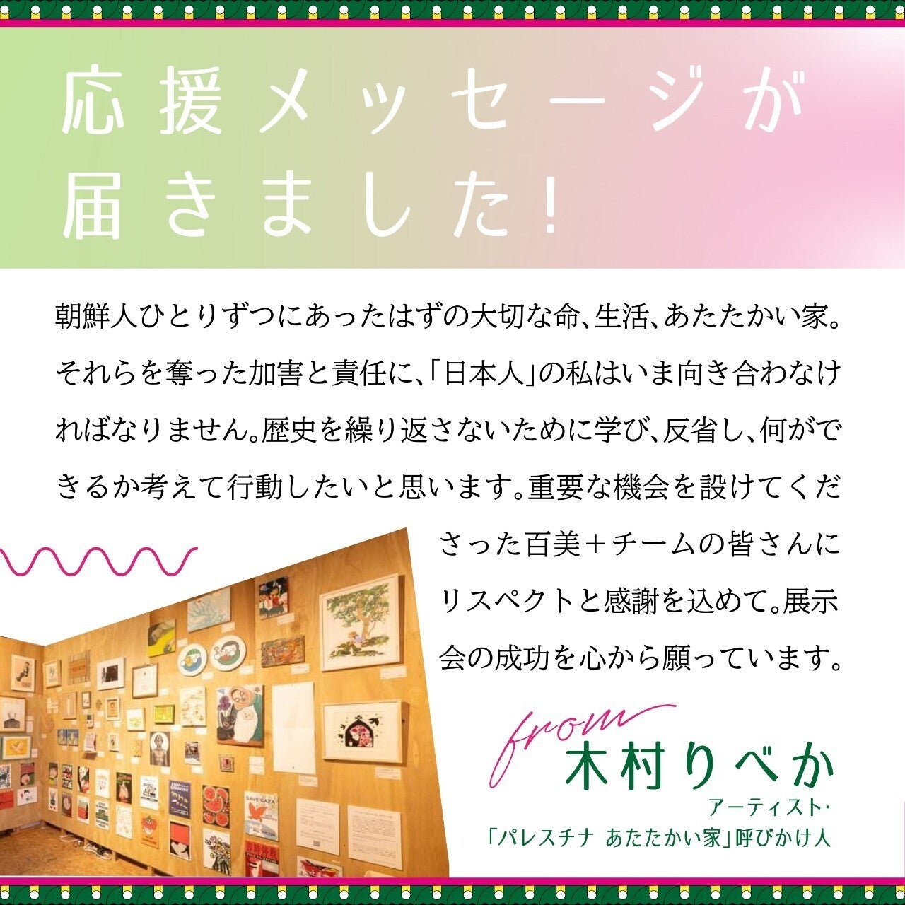 こんにちは、百美+です。皆さまの支援とシェア、ご関心のおかげで昨日、締め切りより早く目標額100%を達成することができました!一同感激しております。本当にありがとうございます。最終日の6/30まで残り5日あるため、ネクストゴールを設定することにしました!今回、出品権ありの支援をしてくださった方がたくさんおり、ご来場いただく皆さまに余裕を持ってご覧いただけるように会場の拡張を考えております(現在調整中)。また、当初の目標額には含められていなかった展示備品(機材など)も、今後の長期的な活動を見据えて購入したいと考えております。ネクストゴールは65万円、目標支援者数は130人です。残り5日間、最後まで応援していただけると嬉しいです!どうぞよろしくお願いいたします。※会場拡張が空き状況などの理由で難しかった場合、機材代やカタログ製作費などに随時資金を回させていただく予定です。