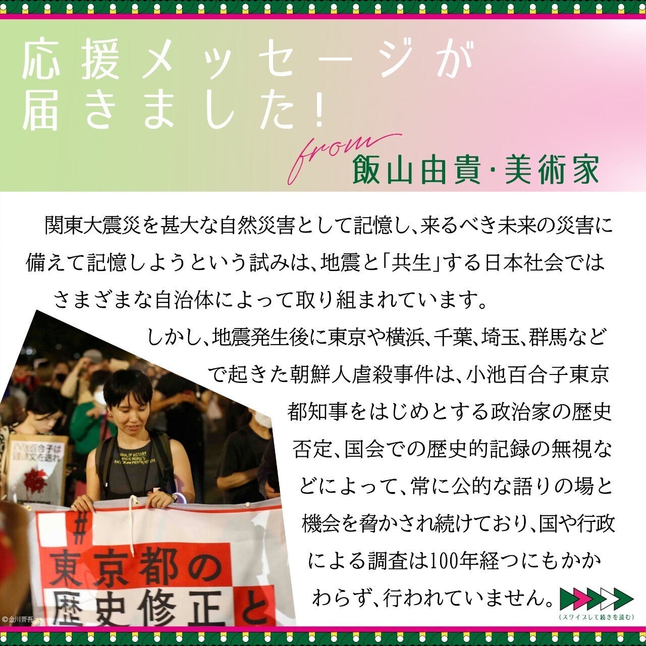 本日は美術家の飯山由貴さんからのメッセージをご紹介します!メッセージの紹介とともに、私たち百美+は、関東大震災の朝鮮人虐殺事件に触れていることなどを理由に飯山由貴さんの映像作品《In-Mates》を検閲し上映中止とした東京都人権部及び東京都に対し抗議することをここに表明します。#東京都の歴史修正とレイシズムによる検閲反対*** 関東大震災を甚大な自然災害として記憶し、来るべき未来の災害に備えて記憶しようという試みは、地震と「共生」する日本社会ではさまざまな自治体によって取り組まれています。 しかし、地震発生後に東京や横浜、千葉、埼玉、群馬などで起きた朝鮮人虐殺事件は、小池百合子東京都知事をはじめとする政治家の歴史否定、国会での歴史的記録の無視などによって、常に公的な語りの場と機会を脅かされ続けており、国や行政による調査は100年経つにもかかわらず、行われていません。 異なるルーツの人々が「共生」する現在の日本社会では、二度と繰り返してはいけない事件であるにもかかわらず、この事実をいろいろな側面から学び、表現し、語る機会を作ることを、人々が草の根で行わなければいけない状況があります。 虐殺を「災害」という言葉のなかに隠し、忘却するのではなく、人が人に為したこと、「人災」として記憶する。この事実に心を寄せる人々に対して、場と機会を開こうとする本企画の趣旨に心から賛同します。***もっと多くの方々に届くよう、シェア・拡散にご協力いただければとってもありがたいです♡初のクラウドファンディングで不安も大きい中、たくさんの方にご支援いただき感謝でいっぱいです。応援メッセージも励みになっております♡残り10日、引き続き応援のほどよろしくお願いいたします!