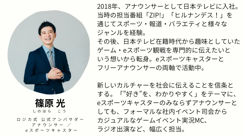 この度、ロジカ式公式アンバサダーである、アナウンサー/eスポーツキャスターの 篠原 光(しのはら こう)さんにご協力いただき、この理想をかなえるための動画を制作することにいたしました。