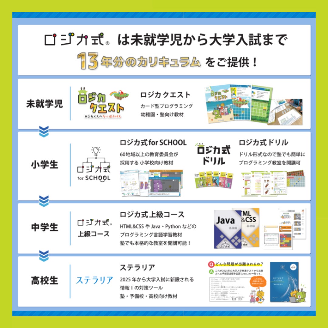 ☆もともとは社会人向けに長年プログラミング教育を行ってきたロジカ式。5歳から大学入試まで一貫した教育体制が整っているので、中途半端にカリキュラムが終わってしまうことがなく、教育投資が無駄にならないので安心です!