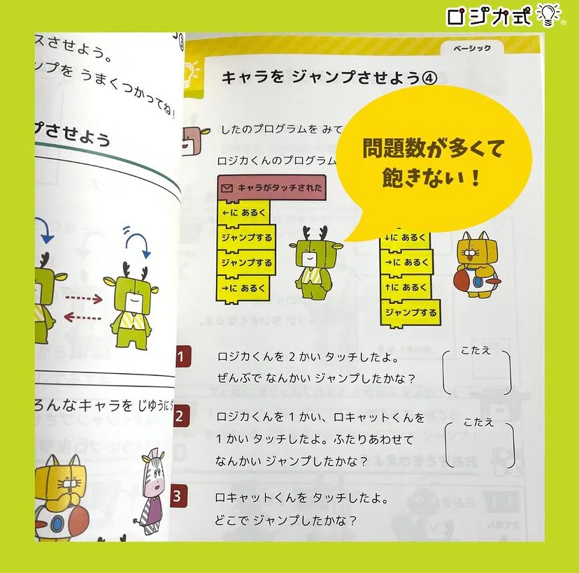 たくさんの問題とイラストで、飽きずに反復学習ができます。ロジカくんの大冒険(アニメ)の世界や、日常のもの、自然界をテーマにプログラミングを学びます。