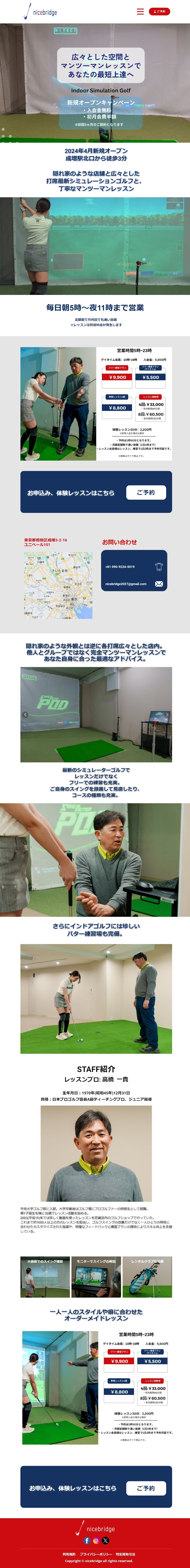 インドアゴルフ練習場「nicebridge」では、施設として優れているだけでなく、楽しく継続して行うことができ、幅広い世代に安全に過ごしてもらえるようなレッスン体制・設備をご用意していきたいと思っています。