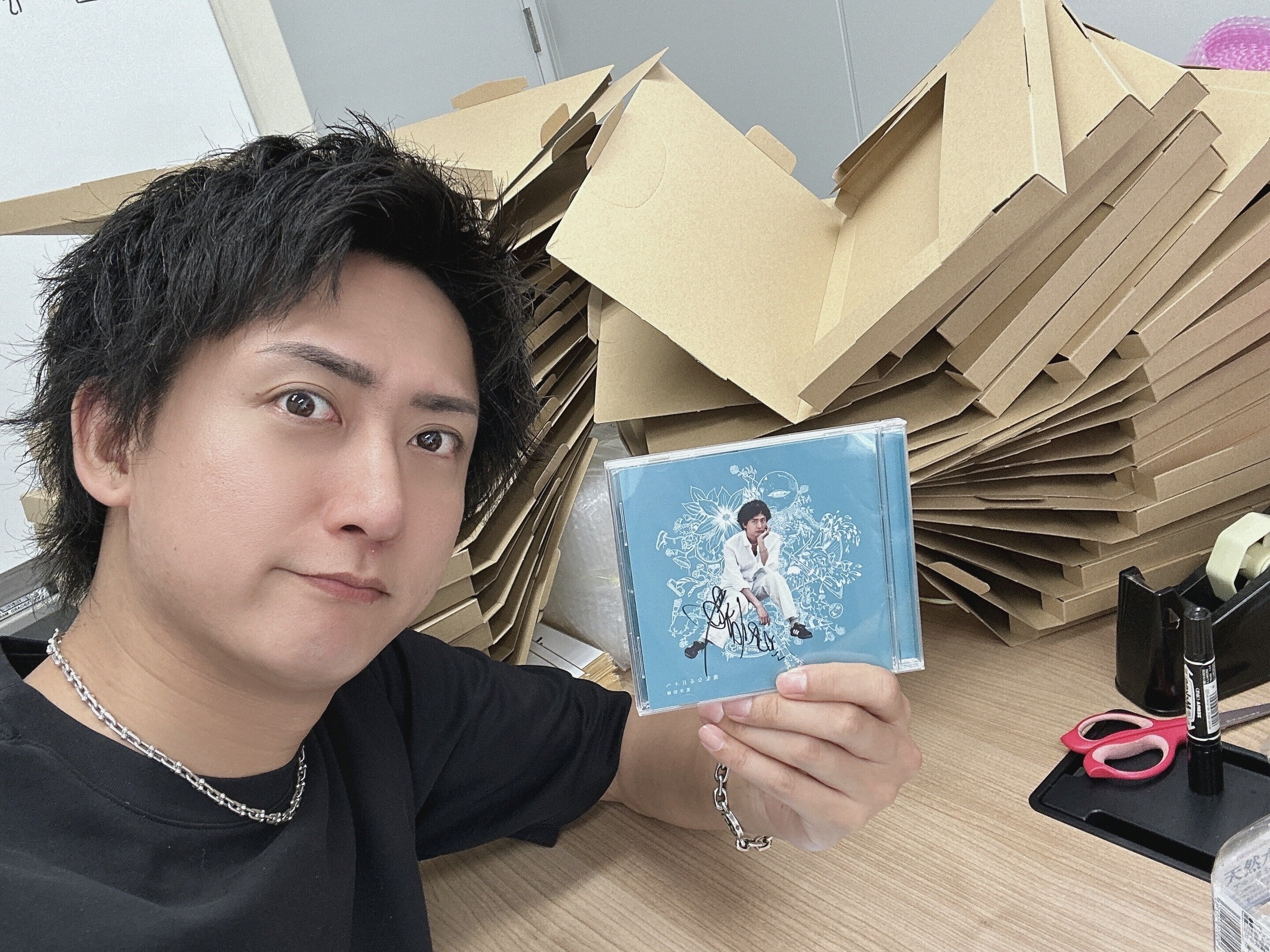 完成したアルバムCDに、荒井佑輝がクラウドファンディング限定の直筆サインを入れます。