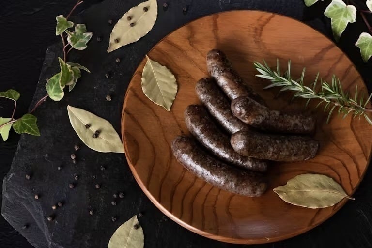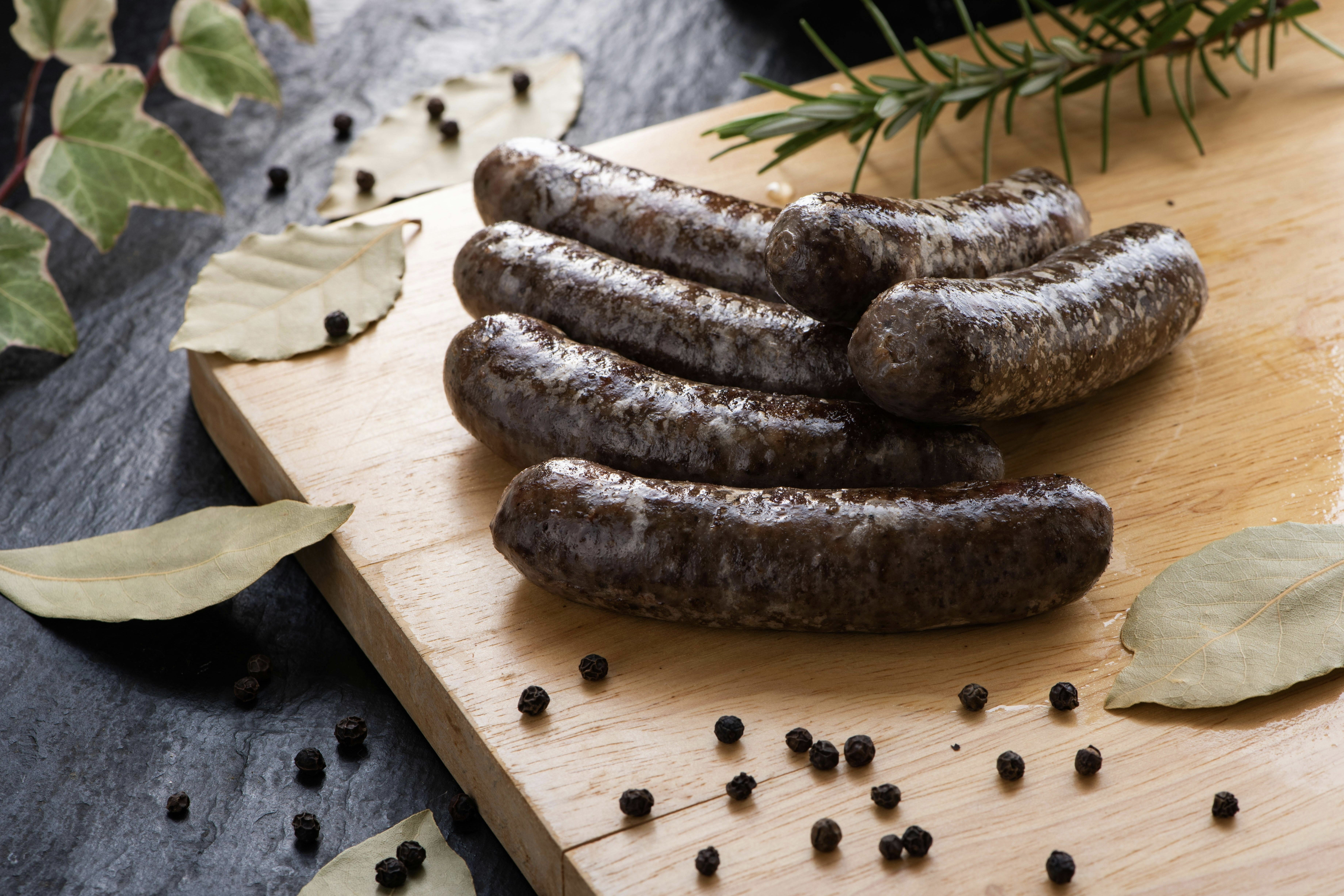 【ブラック】直径22ミリ~24ミリの天然羊腸を使用し、クミンとブラックペッパーを効かせ、カレーを連想させるフレーバーとなっています。宮古島の豚の血を少量入れることにより、コクと甘みと旨味を引き出しています。生臭さは一切なく、ワインとのペアリングは抜群。すりおろしたリンゴや、サルサソースなどの爽やかで少し酸味があるソースとの相性がよい一品となっています。