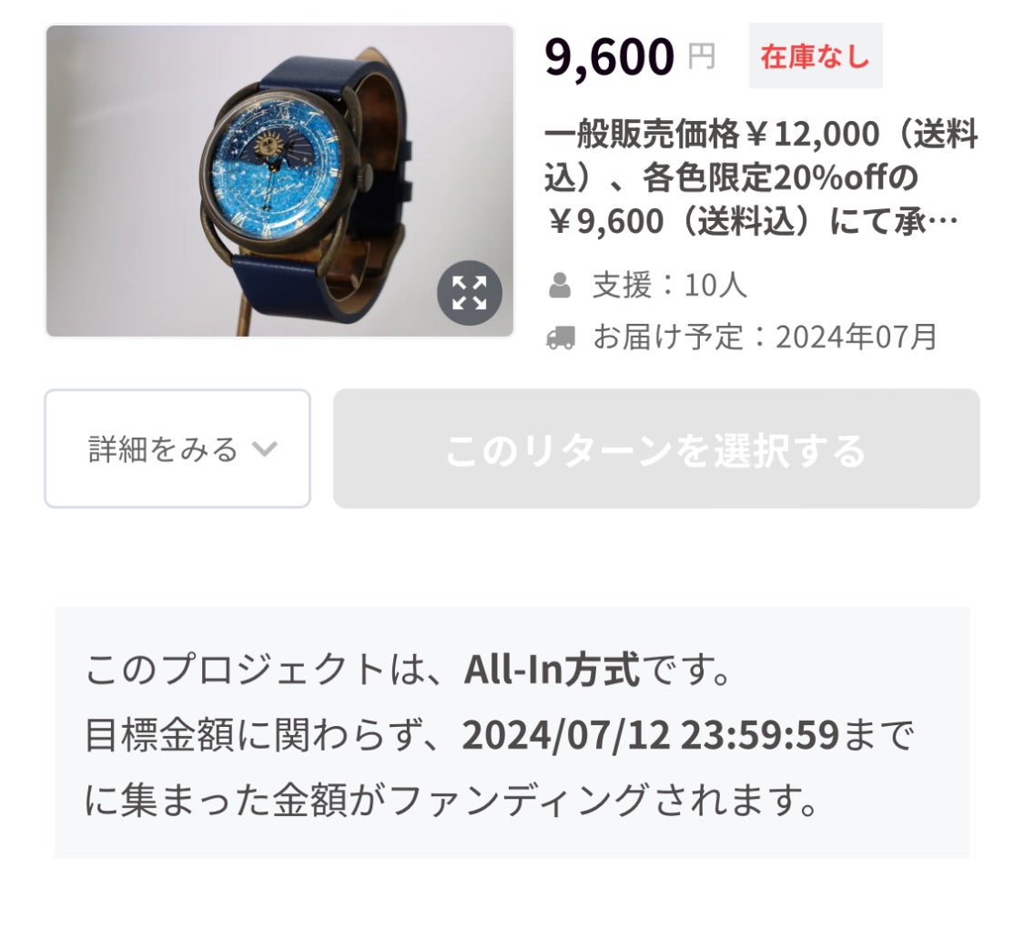 2024/07/04 09:36ご支援頂きました方々、本当に本当にありがとうございます!200%達成しました!!感謝しかないです、ありがとうございます最初は泣かず飛ばずで焦ってばかりでしたが、徐々にご支援していただけるようになり目標達成&200%を越えるご支援となりました、、本当に嬉しい。まだリターン品をお送りして無い方々も沢山いらっしゃいますが、時計が届いて心がわくわくしたり、少し笑顔になったり、とにかく感動をしていただけるように只今製作中ですので今暫くお待ち下さいますようお願い致しますm(_ _)mkeijinの時計を付けた事によってオーナー様の人生が少しでも明るくなるように、また周りの方々も一緒に明るくなれるように祈っておりますあと一週間で終わりますが、ご支援もまだまだお待ちしてます!これからも時計屋keijinを宜しくお願い致します。※枯木星〜冬夜空〜完売しました!!ありがとうございました♪時計屋keijin もっと見る