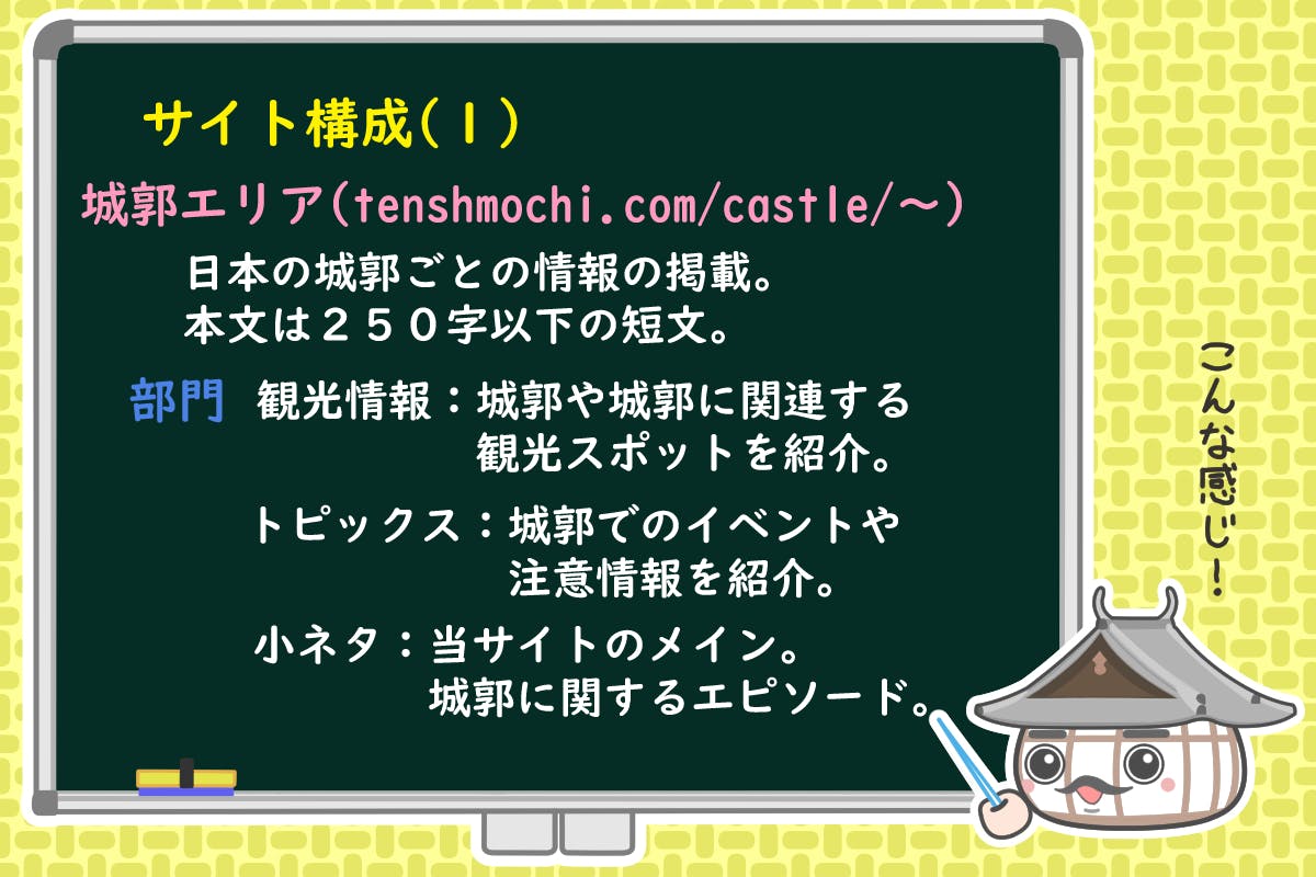 『天守餅』は、日本の各城郭にまつわるエピソードを短文で説明する「小ネタ」をメインとする城郭情報サイトです。ネット記事でありがちな長文ではなく短文にすることによって、サイト訪問者は気軽に情報に触れることができ、たとえば旅行中の限られたスキマ時間でも閲覧を楽しめます。