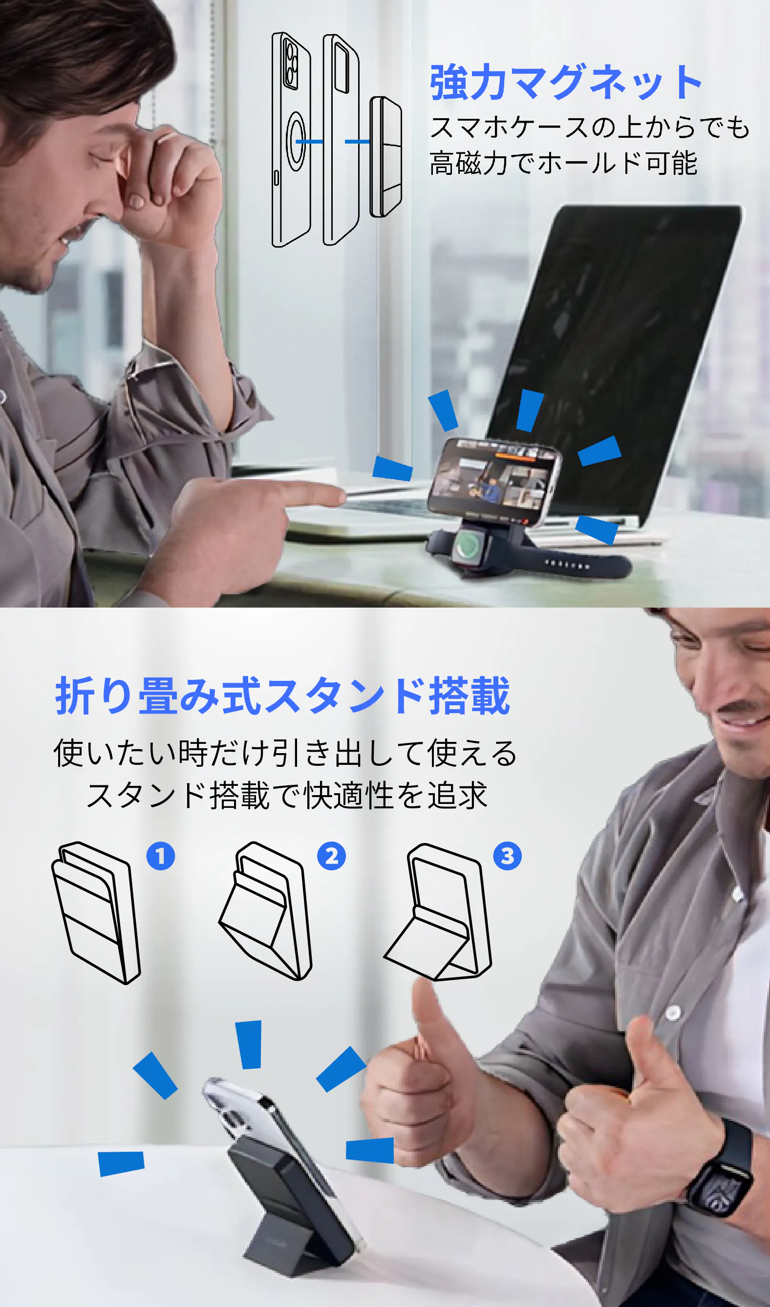 「Mag Stand Mini」に搭載の折畳式スタンドは、いつでも使える背面収納式。スマホスタンドとしても、抜群の使い心地を誇る本格仕様です。