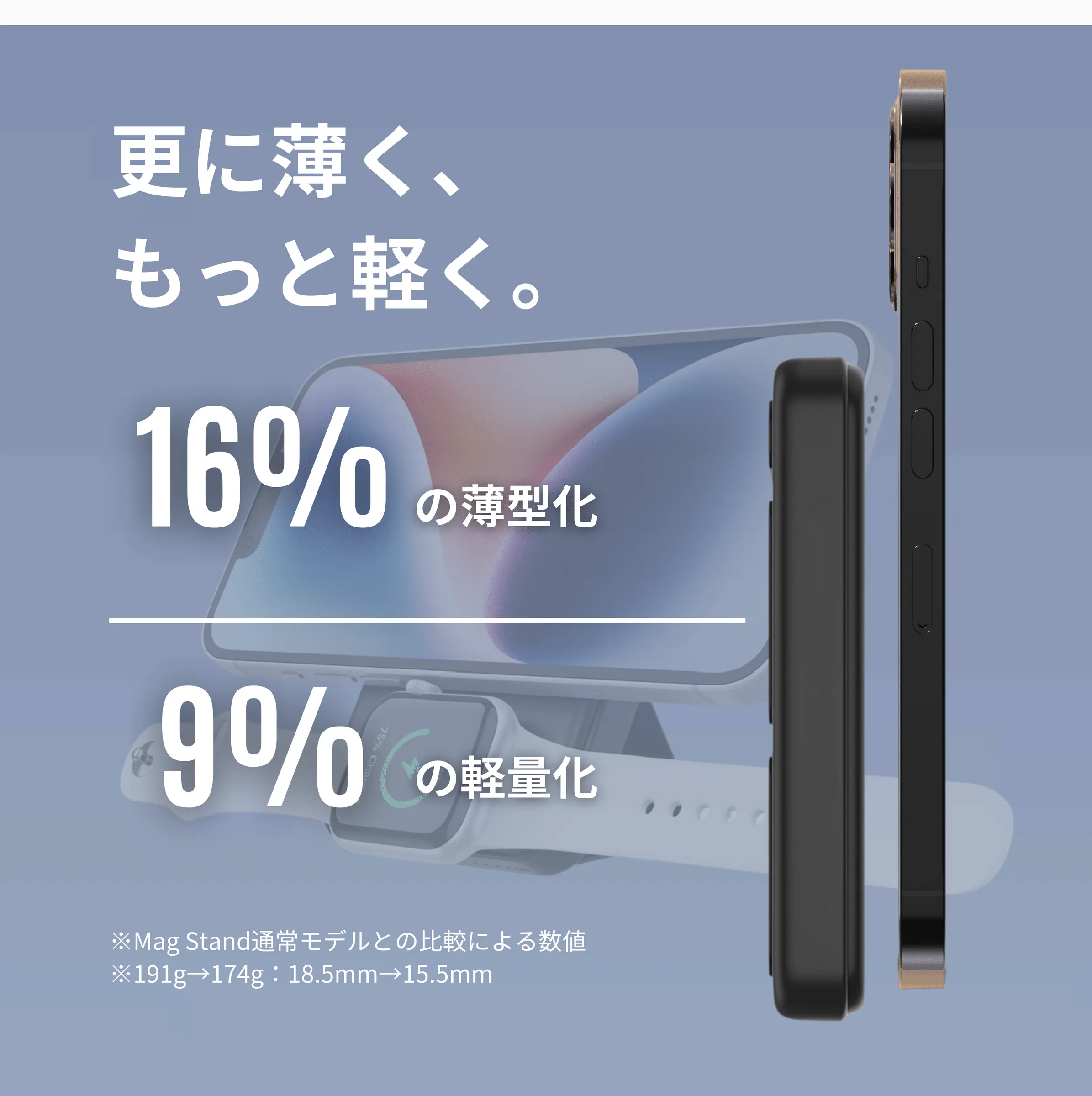 「Mag Stand Mini」の本体はiPhone15 Proよりも軽い174g。長時間でのご使用にも快適にご利用いただける軽量モデルに仕上がりました。