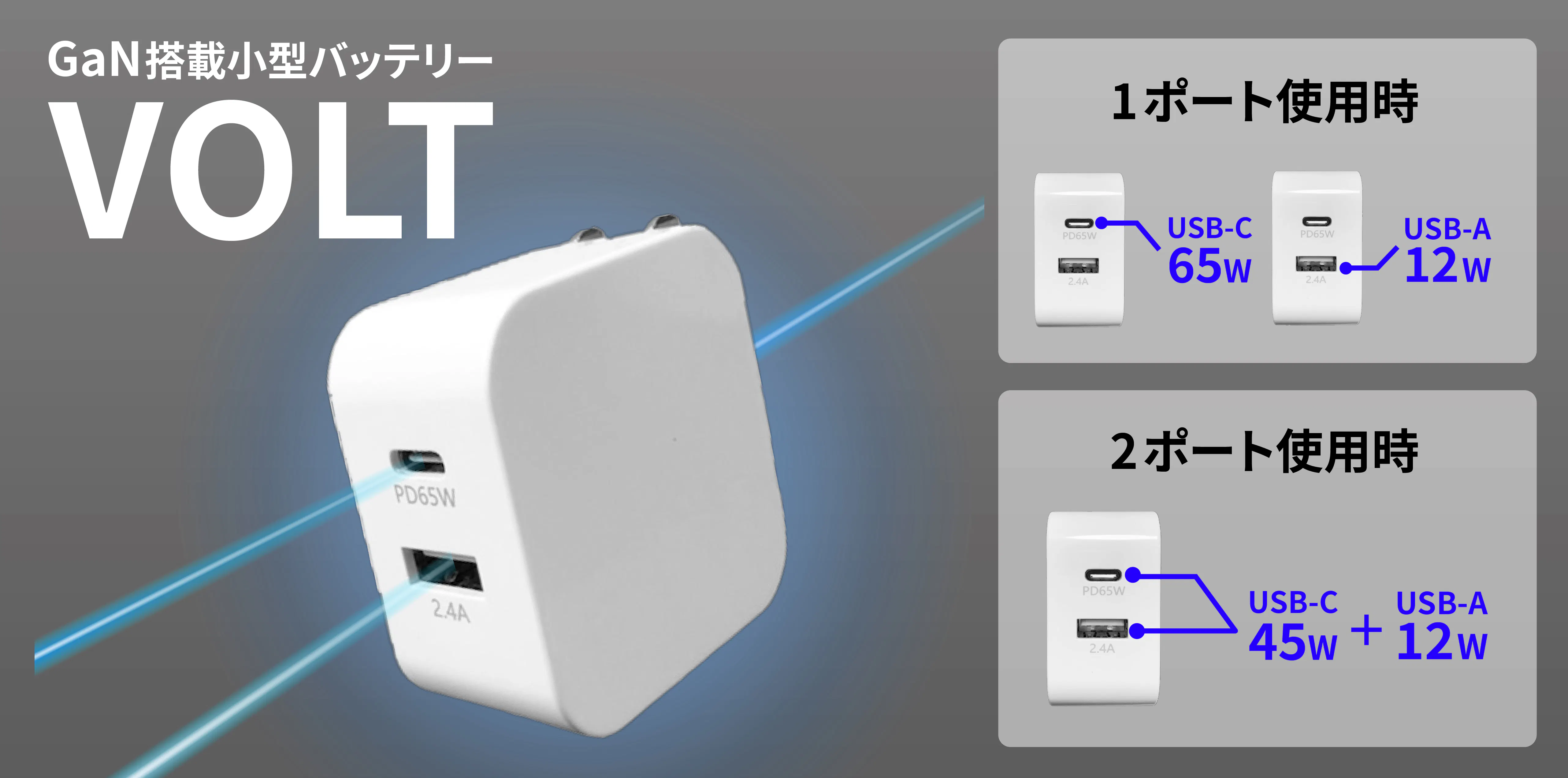 最大出力65W×混合 2ポート搭載使い勝手にこだわった「VOLT」にはUSB-Aポート&Type-Cポートを両搭載。出力振り分け機能により、効率的且つスマートに充電を行います。