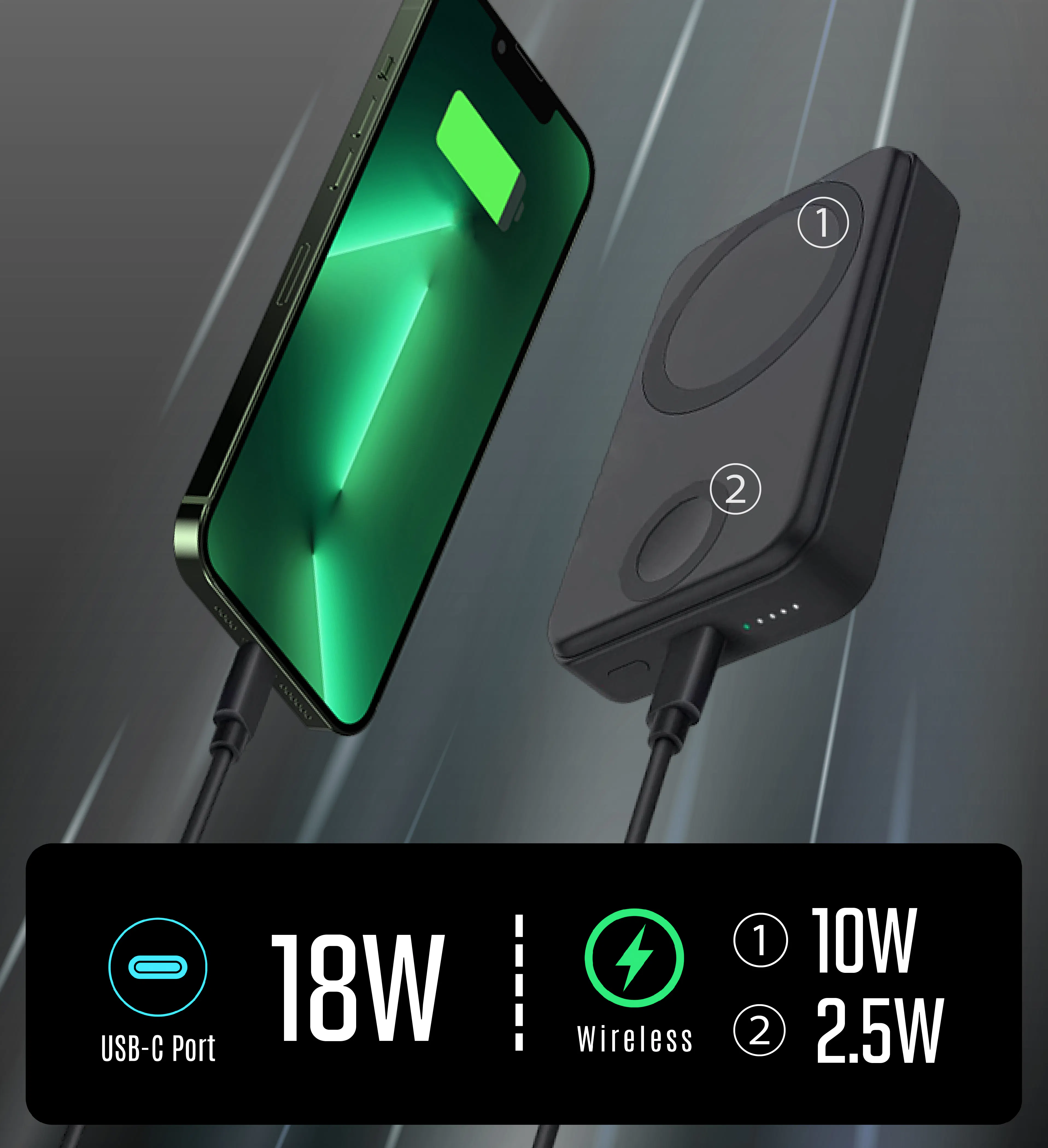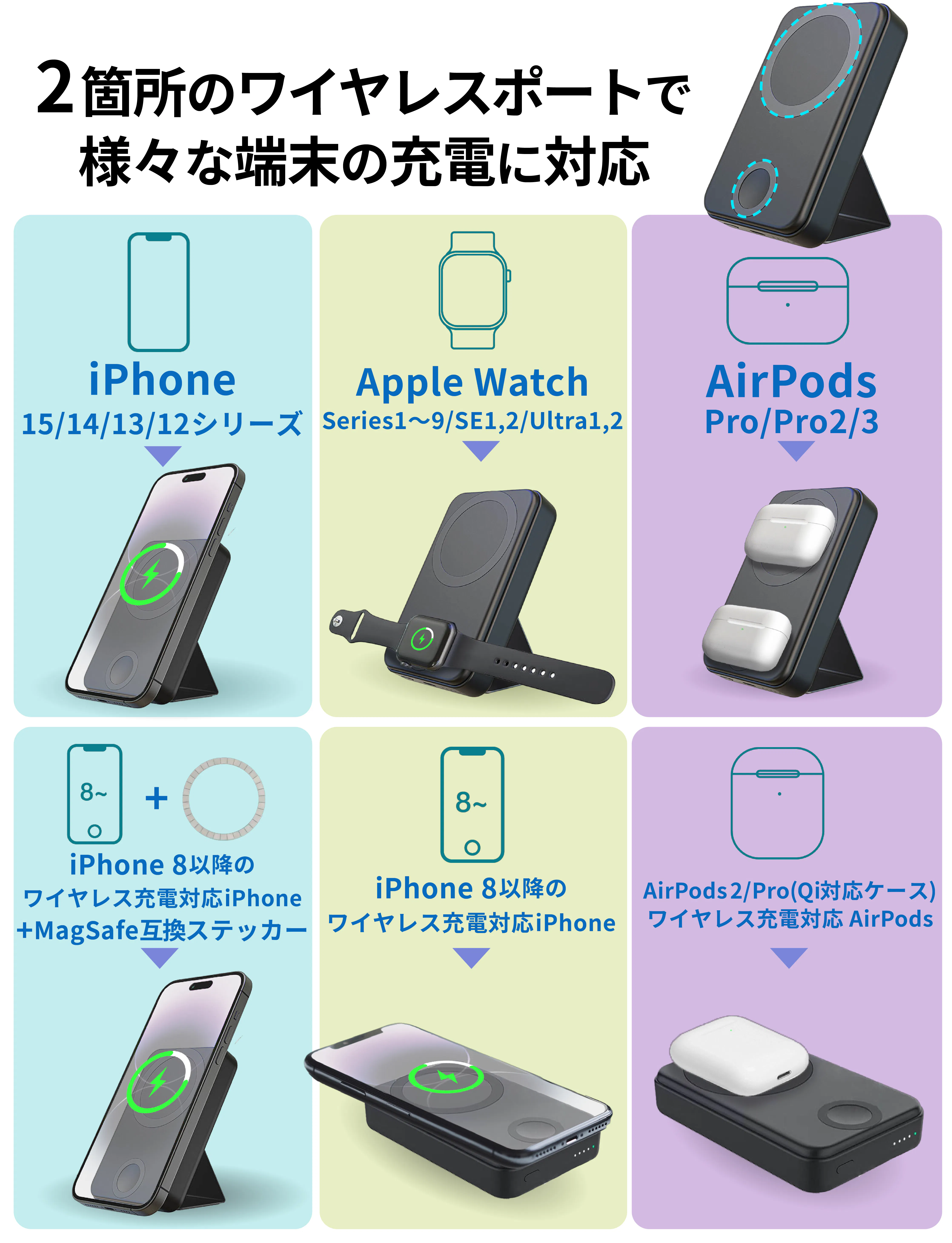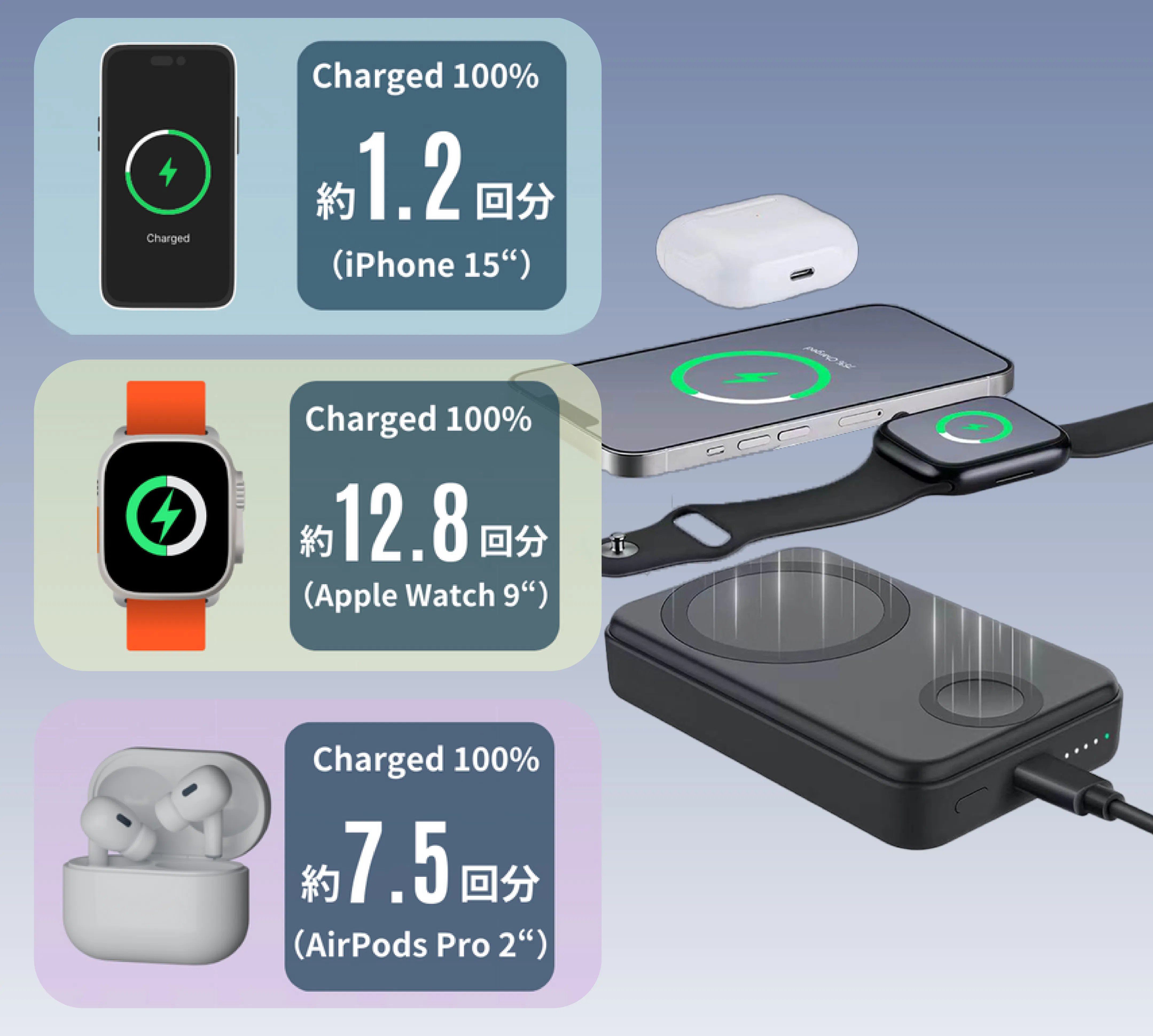 デバイスの充電には、最大3台同時充電に対応可能なハイエンドモデル。ワイヤレス充電に対応していない端末への充電や、バッテリーのシェアにも役立ちます。