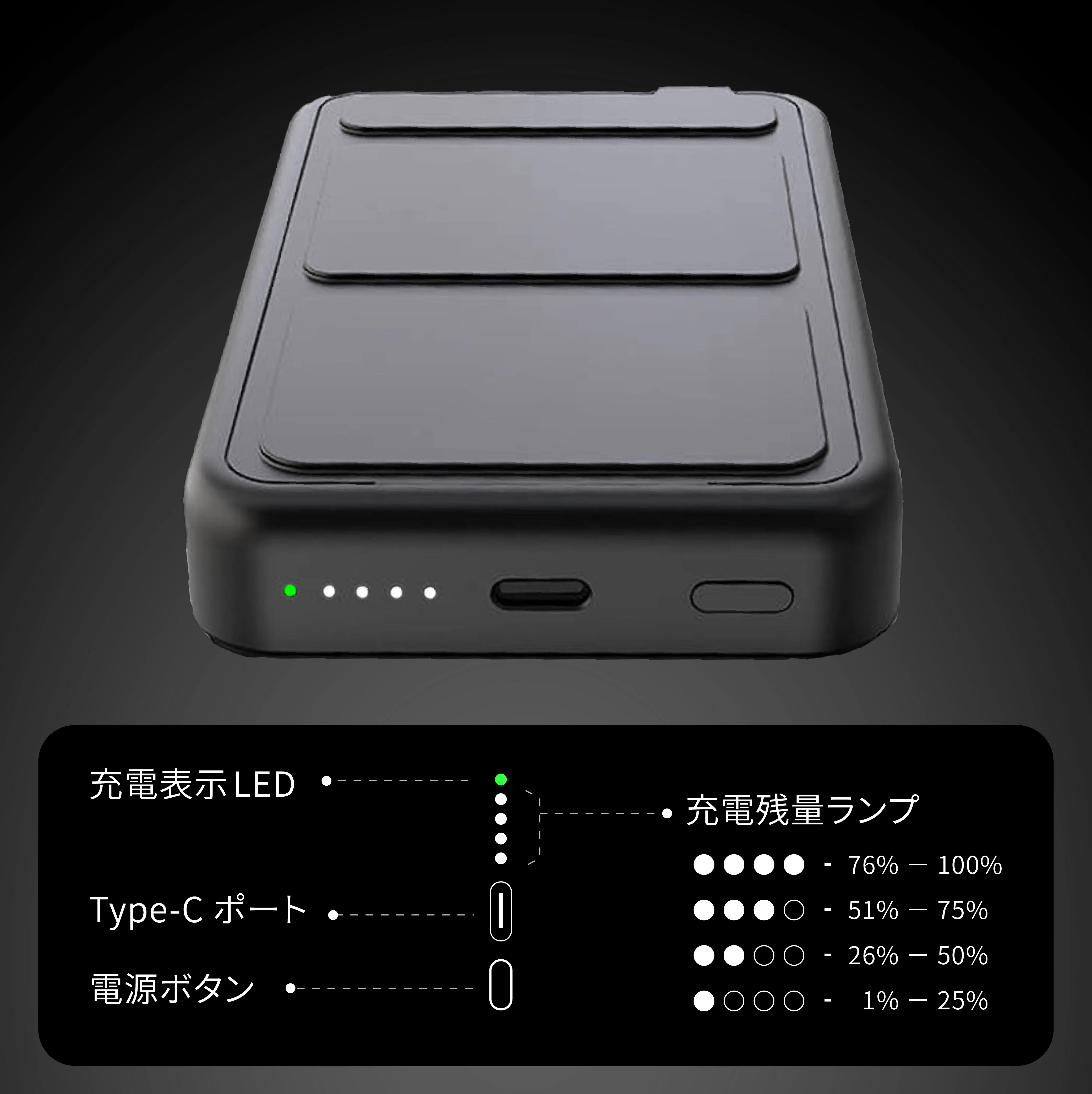 本体の背面には、充電中もそうでない時にも使える折り畳み式のスタンドを搭載。モバイルバッテリーから充電以上の機能と体験を収納しました。