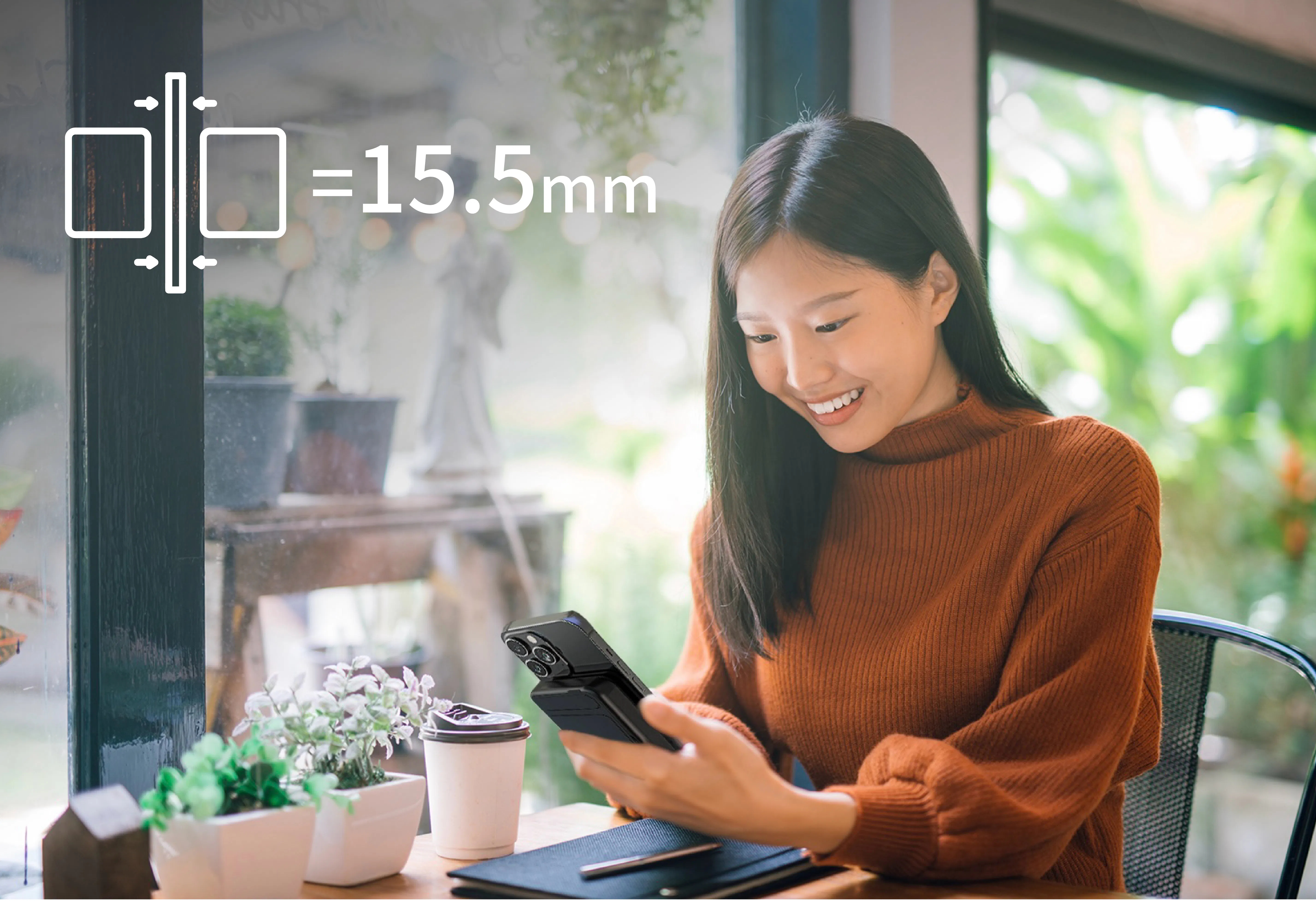 本体の接続面はスマートフォンの凹凸カメラを考慮したサイズを維持しつつ、更に薄い“15.5mm”の手に馴染む薄型ボディを追求しました。
