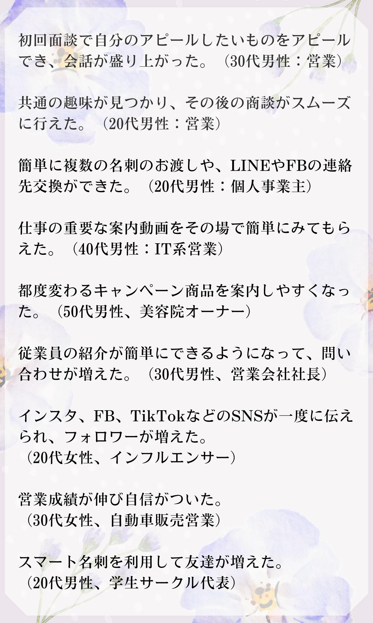 Smart名刺「飛んでけ自己紹介」を、実際にご活用いただいた方々からの体験談をご紹介いたします。