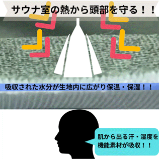 肌から放出された水分が「のぼせシラズ」に吸収され、生地内に広がることで、ハット内が保温・保湿され、高温のサウナ室でも快適に過ごせるんです!!