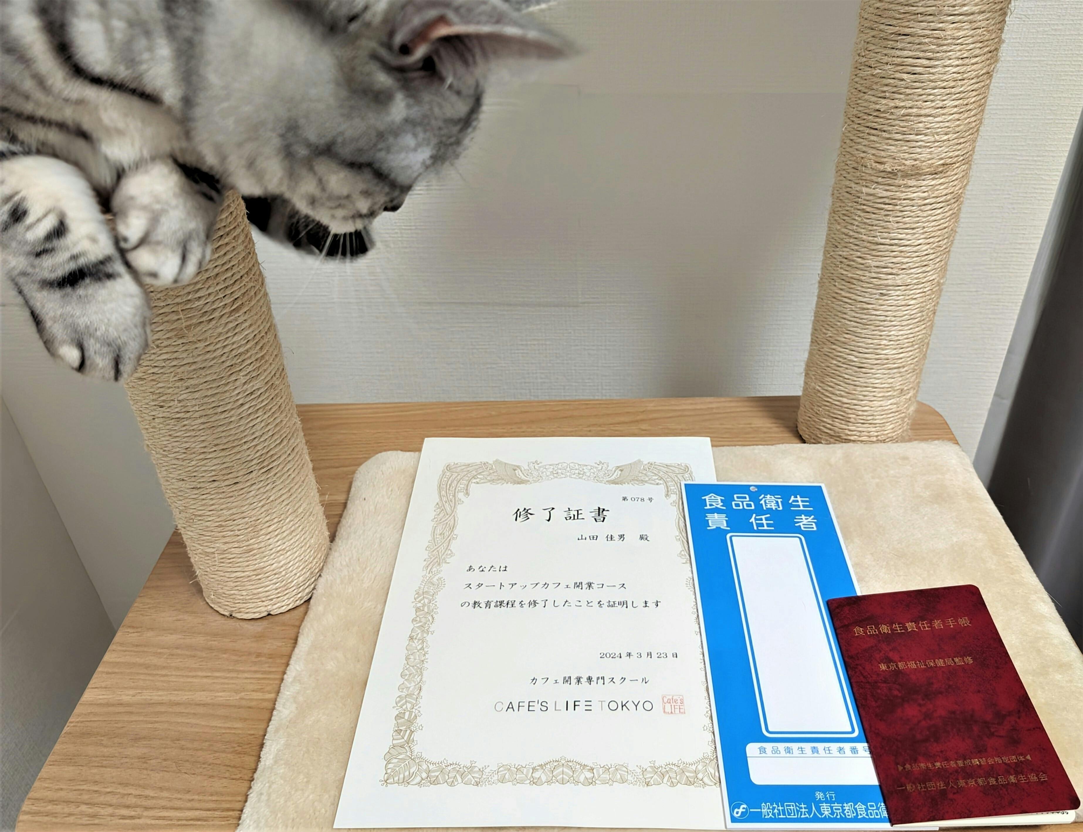↓「CAFE’S LIFE TOKYO」の修了証書、「食品衛生責任者」のプレートと手帳