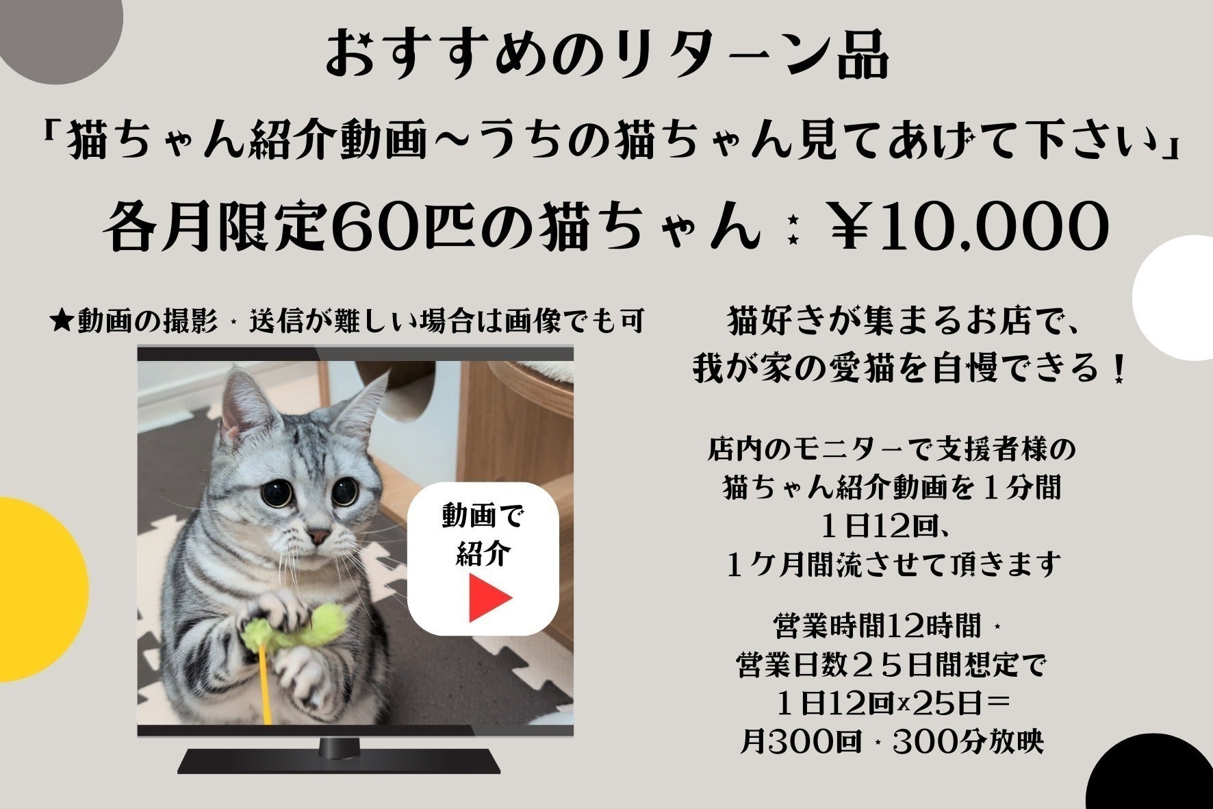 2026/03/01 08:36私がまだまだ未熟の為、なかなかご支援に繋がっておりませんが、おすすめのリターン品「猫ちゃん紹介動画」は最終的なご支援様数にもよりますが、もし1名のみのご支援様数だった場合は、営業中はご支援様の猫ちゃん動画のみが独占で1日約720回流れる計算となります。ご支援様数2名の場合は360回、3名の場合は240回。ぜひご検討頂けますと幸いです。引き続きよろしくお願い致します。 もっと見る