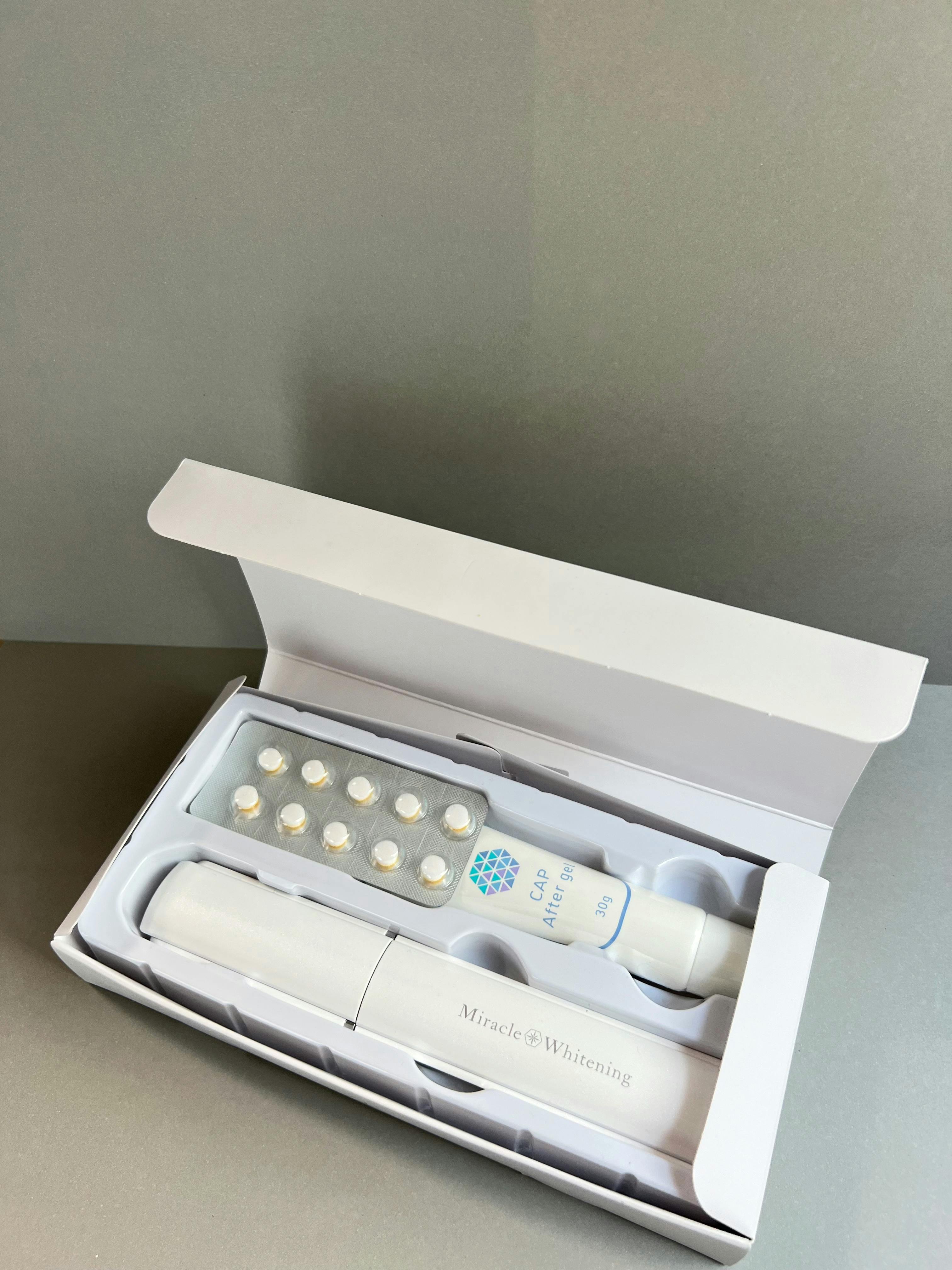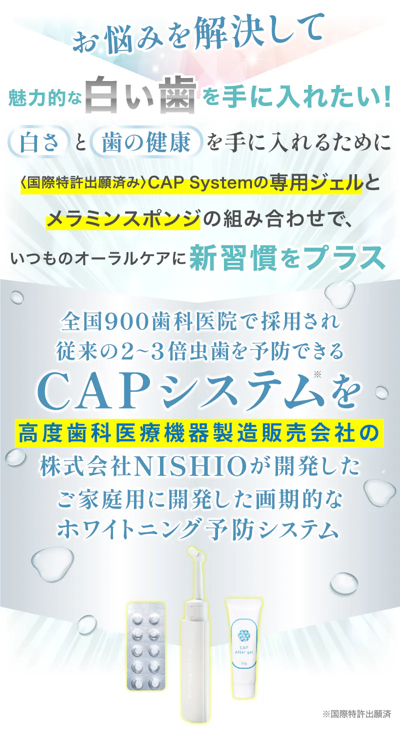 全国900歯科医院で採用されている、〈国際特許出願済〉CAPシステムをご家庭向けホワイトニングへ組み込んだ新たなシステム、それが「ミラクルホワイトニング」です。