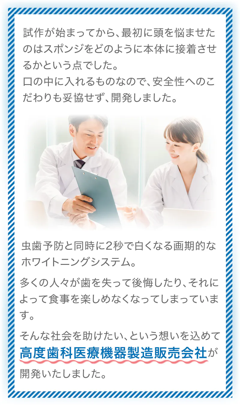 手軽に白くなるホワイトニング製品は、これまでにない製品であり、オリジナルの画期的なホワイトニング製品に仕上げることができました。
