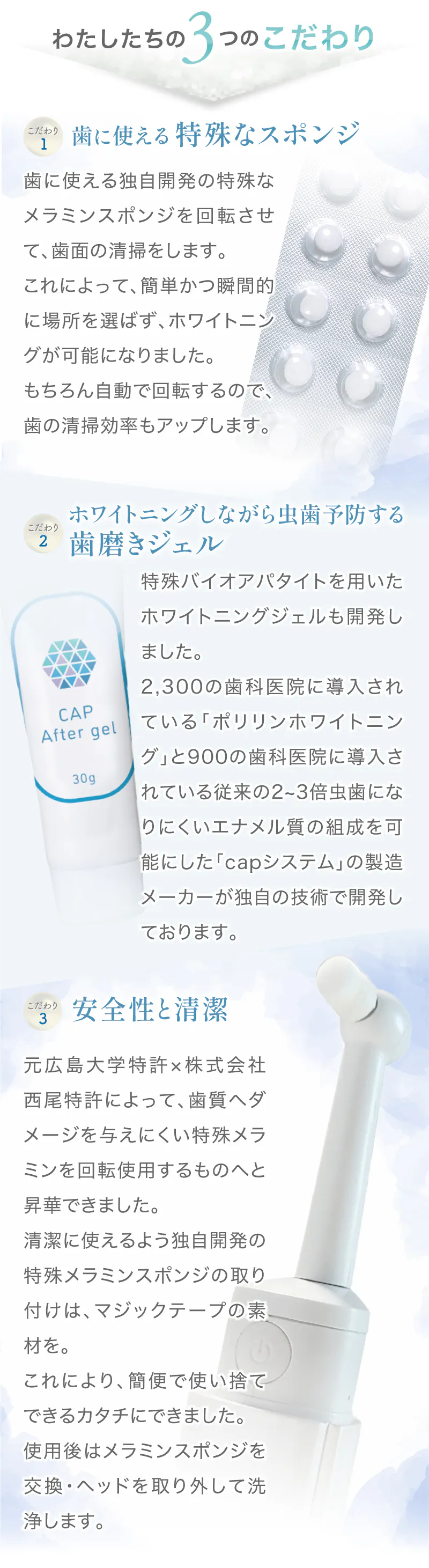 歯専用のメラミンスポンジは広島大学が開発した特殊なメラミンフォームを使用しています。