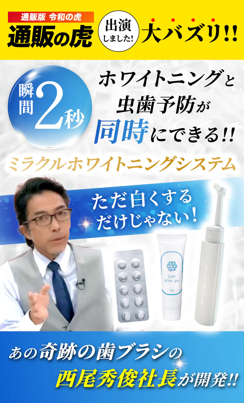 あの奇跡の歯ブラシの西尾秀俊社長が開発した、いつでもどこでも手軽にホワイトニング*ができる、新感覚の「ミラクルホワイトニング」。