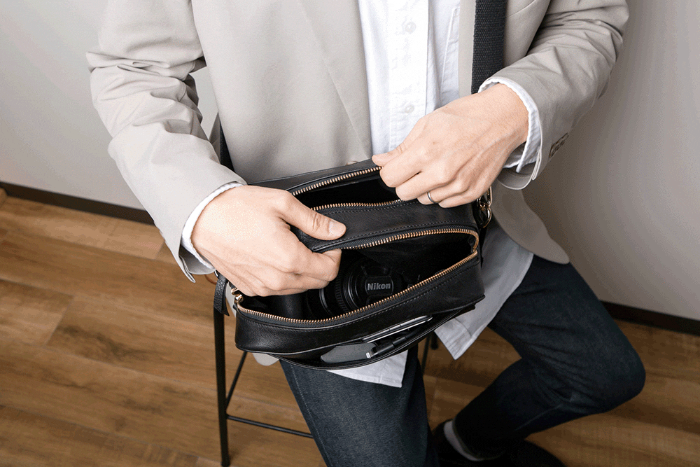 大人の遊び心をサポートする、コンパクトな見た目以上の収納力。撮影使いとしてのバッグとしても重宝します。